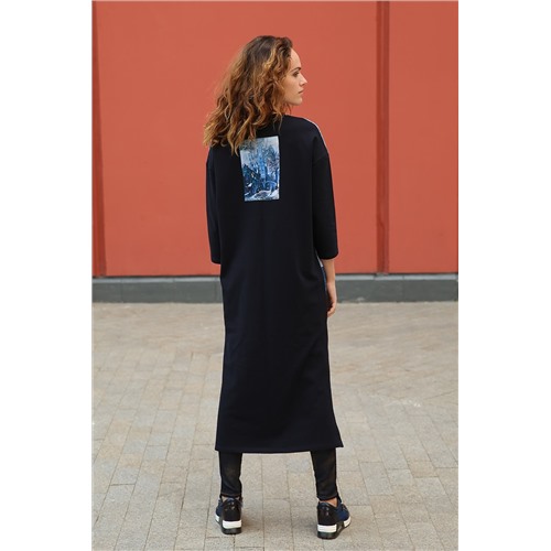 Размер 44, платье довольно свободное (по запросу могу замерить), хорошо будет и на 46/48. Страна-производитель Россия Отделка Авторский принт Состав 60% хлопок 32% п/э 8% лайкра Рукав 3/4 Цвет Синий Вопросы по товару