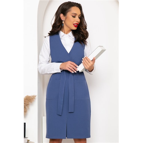 Платье-сарафан средней длины в базовом офисном оттенке обязательно должен быть в гардеробе каждой стильной леди, так как легко и красиво сочетается с множеством вещей: водолазками, лонгсливами, мягкими джемперами и блузами. Сарафан полуприлегающего силуэта, на поясе, лиф на запахе. В левом боку потайная молния. Юбка сарафана по переду украшена разрезом, по обе стороны от которого расположены два накладных кармана. Пояс из основной ткани входит в комплект.