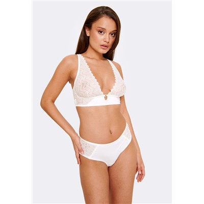 Бюстгальтер с мягкими чашками на каркасах. Бюстгальтер выполнен из эластичного кружева теплого молочного цвета. Геометричный узор, мягкие чашки косточек и оригинальный вырез под грудью создают современный образ. Ажурный край декольте и полукруглый вырез на спинке притягивают взгляд. Широкие регулируемые бретели, лента под грудью и застежка на 2 крючка обеспечивают оптимальную посадку и комфорт. Без push up. 90%Polyamide/10%Elastane