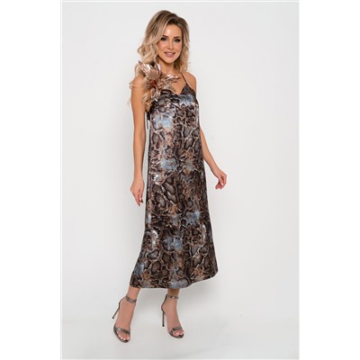Для размеров 42, 44 и 46 длина платья составляет 110 см, для размера 48 - 111 см, для размера 50 - 112 см, для размера 52 - 113 см. Ткань (основная и подкладочная): блузочно-плательного ассортимента, тонкая, струящаяся, гладкокрашенная, с мягким атласным блеском, скользкой фактурой, с незначительным стрейчевым эффектом. Состав: полиэстер 97%, эластан 3% Цвет основной ткани: принт "рептилия" (среднего размера). (!) Яркий декор-брошь из лепестков в кадре НЕ ВХОДИТ в комплект и стоимость платья. Не является товаром DuSans, не предлагается к продаже. Платье на подкладке. Стиль: женственный, бельевой. Силуэт: полуприлегающий, с небольшим расширением книзу в боковых швах Линия плеч: открытая. Длина и направление тонких бретелей "рулик" из основной ткани регулируются по спинке в бант. Пройма: углублена (открытая), обработана "в чистую". Перед: неразрезной. Нагрудная вытачка направлена из бокового шва. Горловина: V-образной формы, сильно открытое декольте. Спинка: неразрезная, горловина горизонтальной формы опущена до линии проймы. Верх обработан эластичной лентой (для хорошей фиксации). Комментарии к товару