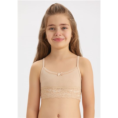 Бюстье для девочек. Передний и задний срезы окантованы ажурной, тонкой резинкой. Пройма, переходящая в бретели, обработаны бейкой, по низу ажурное, эластичное кружево. В центре изделие украшено маленьким бантиком.
