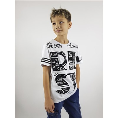 Футболка-прямой силуэт, рукав втачной короткий. Перед и рукава с печатью. Горловина обработана ластиком. Низ изделия и рукава подшиты.
