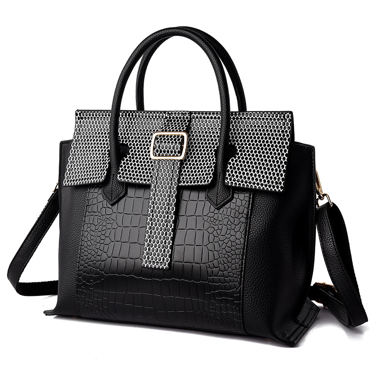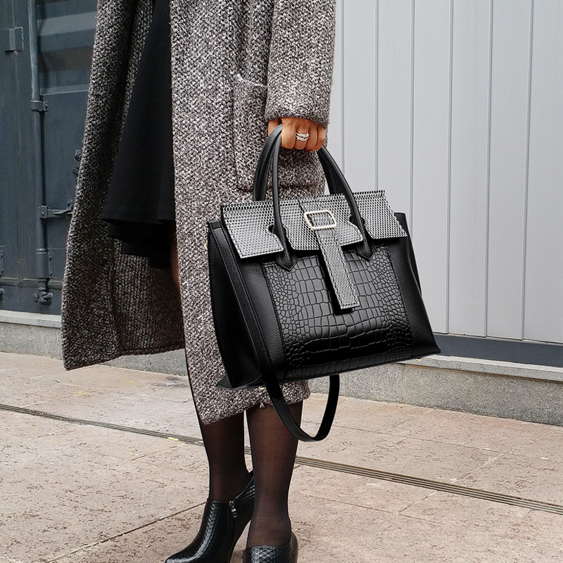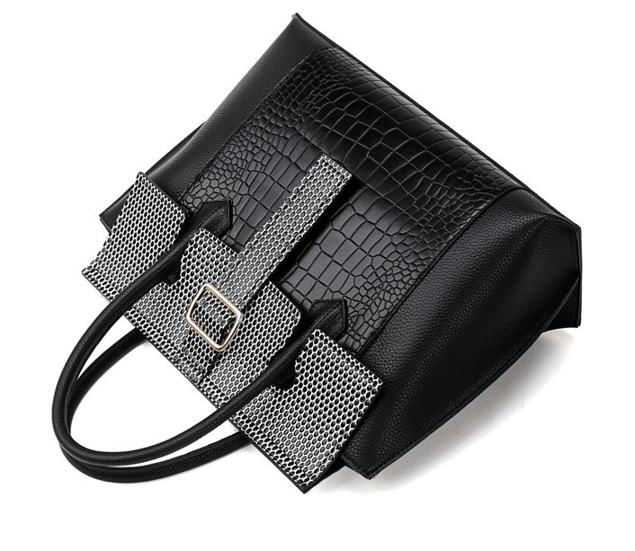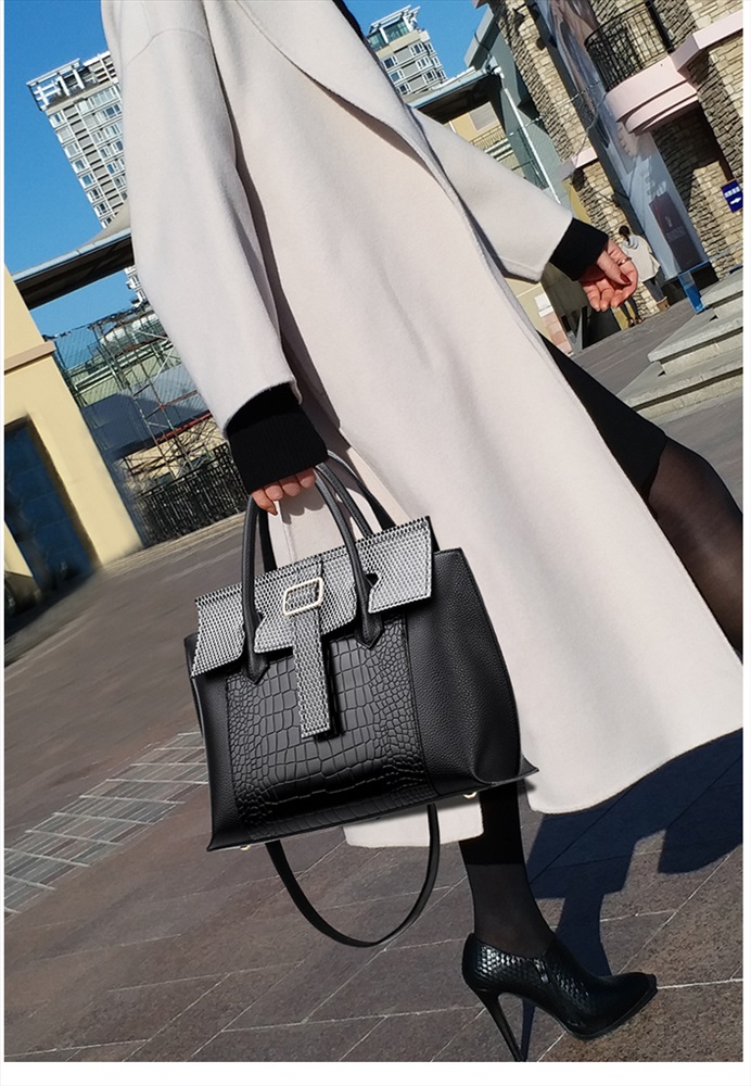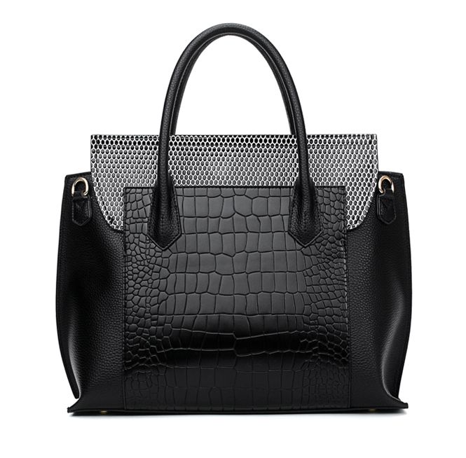 Сумка выполнена из сочетаний нескольких видов экокожи: в выделкой под змеиную кожу, под кожу крокодила и телячью кожу.