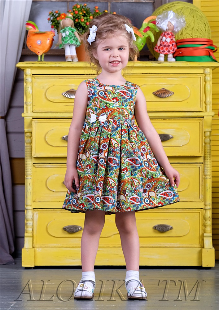 Платье из 100%-хлопка для девочек дошкольного возраста. Платье очень яркое, выделяется за счет интересного красочного принта. Лиф с круглым вырезом горловины и слегка завышенной талией. Застежка на спинке на пуговицы, юбочка на хлопковом подкладе. Милый белый бантик спереди добавляет платью нарядности. Этот наряд подойдет для любых мероприятий, в нем всегда будет легко и уютно. Состав: Верх 100% хлопок, подклад 100% хлопокКомментарии к товару