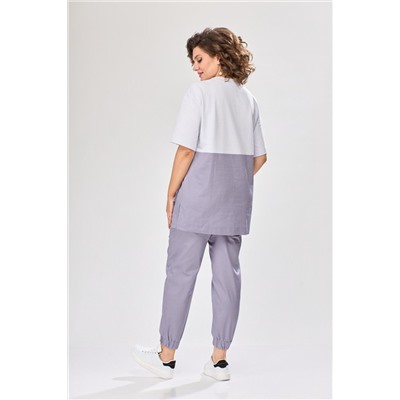 Костюм состоящий из блузки и брюк, выполнен из однотонной ткани и контрастного по цвету однотонного трикотажного полотна.