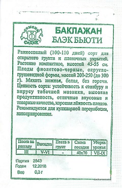 Раннеспелый (100-110 дней) сорт для открытого грунта и пленочных укрытий. Растение компактное, высотой 45-55 см. Плоды фиолетово-черные, округло-грушевидной формы, массой 200-250 (до 300 г). Мякоть нежная, белая, без горечи. Ценность сорта: устойчивость к столбуру и вирусу табачной мозаики, высокая продуктивность, отличные вкусовые и товарные качества, хорошая лёжкость плодов. Рекомендуется для кулинарной переработки, консервирования. Фасовка 0,2г Комментарии к товару