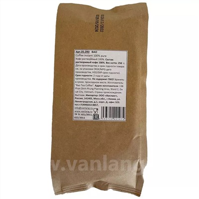 Вкус...: С кислинкой,С горчинкой, Вес нетто, г: 250 Упаковка: Фольгированный вакуумный пакет Содержание кофеина: не менее 1.2% Остаточная влажность, не более: 5% Страна производства: Вьетнам Страна бренда: Вьетнам Регион произрастания: Далат Способ приготовления: Насыпьте 1-2 ч.л. растворимого кофе в чашку, залейте 75-150 мл горячей воды, тщательно перемешайте. Добавьте сахар, сливки, лед по вкусу. Срок годности: 2 года Вьетнамский натуральный растворимый кофе. Состав: 100% черный растворимый кофе. Нетто - 250 г. Растворимый кофе произведен непосредственно из кофейных зерен. Имеет насыщенный вкус, выраженный аромат свежеприготовленного кофе. Подходит людям с различными видами пищевой непереносимости, так как не содержит сахар, молоко, глютен. Прост в приготовлении. Комментарии к товару
