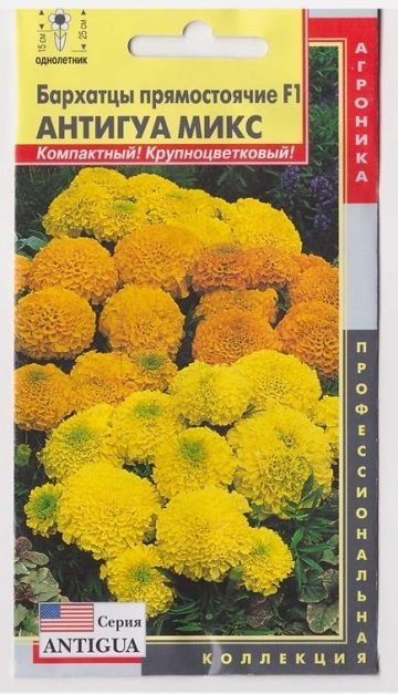 Бархатцы из серии ANTIGUA являются лидером среди гибридных сортов бархатцев прямостоячих. Отличаются идеальной выравненностью цветков и возможностью выращивать густыми посевами, создавая четкий узор или кайму. Цветки довольно крупные, насыщенного яркого цвета, густомахровые. ANTIGUA - незаменимые помощники при оформлении цветника, клумбы и бордюра. Кустики невысокие, всего 20-25 см в высоту, очень компактные. При выращивании рассадным способом имеют один цветонос и до пяти цветоносов при посеве в открытый грунт. Предпочитает незатененные, солнечные участки. Обладает отличным сочетанием с другими цветами, идеален для выращивания в вазонах и контейнерах при оформлении балконов. Хорошо переносит неблагоприятные климатические условия. ПОСЕВ: для длительного и раннего цветения выращивают через рассаду, высевая семена в ящички с третьей декады февраля по март, при посеве в открытый грунт – в конце мая высевают на постоянное место с последующим прореживанием. Землю предпочитают торфяную с добавлением комплексных минеральных удобрений, требуется дренаж и слабокислая среда - примерно рН 5,8-6,2. Семена чуть присыпаются землей и накрываются темной плёнкой, благодаря чему поддерживается нужная для всходов влага. Через неделю появляются дружные всходы, благоприятная температура не ниже 20-22