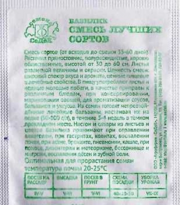 Смесь сортов (от всходов до срезки 35-60 дней). Растения прямостоячие, полураскидистые, хорошо облиственные, высотой от 30 до 60 см. Листья различной величины и окраски. Ценность смеси: широкий спектр вкуса и аромата, ценные пищевые и лечебные свойства. В пищу употребляют листья и нежные молодые побеги, в качестве приправы к различным блюдам, при консервировании, мариновании овощей, для ароматизации соусов, бальзамов и уксусов. Из семян готовят непревзойдённые лечебные бальзамы, настаивая их на водке (50-100 г/л), в течение 3-4 недель в тёмном прохладном месте. Настои и отвары из листьев и цветов базилика принимают при отравлении алкоголем, при гастритах, колитах, воспалении почек, при астме, бронхите, пневмонии, кашле, при поносе, дизентерии и метеоризме, бессоннице и мигрени, воспалении дёсен и зубной боли. Фасовка 0,5г Комментарии к товару