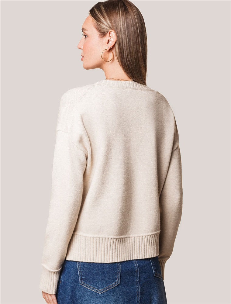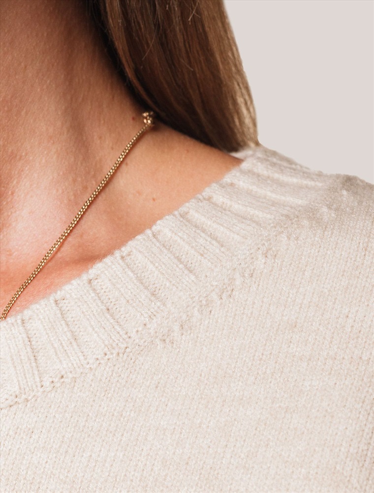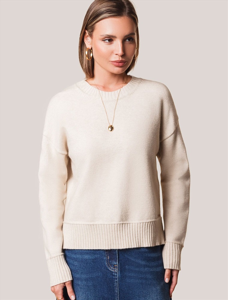 Размер товара на первом фото: 42 Укороченный джемпер овсяного цвета с эффектом меланж с круглым вырезом связан из высококачественной пряжи с кашемиром — идеальное сочетание мягкости и практичности. Пряжа с кашемиром придаёт ему бархатистую нежность и тонкую структуру, каждое прикосновение с которой, напоминает о тепле и уюте в прохладные дни. Благодаря нежной текстуре материала этот вариант отлично подходит даже для чувствительной кожи, не вызывая раздражения и дискомфорта в течение дня. Сдержанный, элегантный силуэт джемпера подчёркивает вкуc обладательницы, а филигранная отделка ворота — внимание к деталям. Универсальный оттенок и изящная мягкость делают его идеальным выбором в любой ситуации Широкие манжеты и нижний край добавляют аккуратности, а продуманная посадка и небольшие разрезы по бокам делают повседневный джемпер удобным для многослойных образов — от офисного комплекта до расслабленного уикенда. Свободный крой джемпера идеально подходит для женщин, которые ценят удобство и стиль одновременно, а так же идеальноподходит на большие размеры. Благодаря качественной пряже свитер сохраняет форму и внешний вид даже после многократных носок. Практичный фасон идеально подходит для работы в офисе или встреч с друзьями. Благодаря классическому крою джемпер гармонично сочетается практически с любыми элементами гардероба, помогая всегда выглядеть актуально. Сочетается в костюме с брюками D38.013, D38.012 и юбкой D36.016