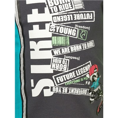 Комплект из футера для мальчиков свитшот и брюки. Свитшот умеренного объёма с мягким спущенным плечом. Контрастная горловина из рибаны. С правой стороны вертикальное членение и принт, имитирующие ассиметричную застежку на молнию. По центру rubber принт с неоном. Надписи Улица, рожденный ездить, будущая легенда, свобода, такой молодой, будь разным будь собой. Брюки джоггеры, зауженные. Пояс и манжеты из рибаны. Пояс с внутренней регулировкой шнурком. Товары ТМ Pelican отгружаются без скидок, все цены фиксированные от производителя. Обратите внимание: Товары ТМ Pelican находятся на удаленном складе. Как определить размер?Все таблицы размеров Pelican (откроется в новом окне)Комментарии к товару