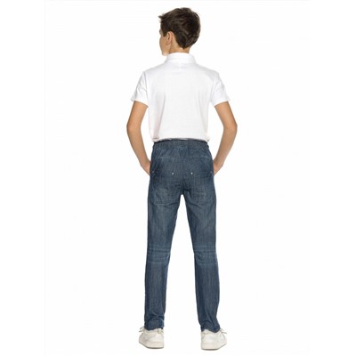 Джинсы расслабленного силуэта. Крой, детали и варка как у классических джинсов полукруглые боковые карманы спереди, кокетка и накладные карманы на спинке, отвороты по низу брюк. Швы на коленях выполняют формообразующую функцию и способствуют более комфортному сгибанию. Пояс брюк фиксируются на широкую резинку, регулировка объема контрастным шнуром. Принт с надписями, перевод Рожденный быть умным, Умный, Умный стиль, Создатель будущего, Наслаждайся будущим.