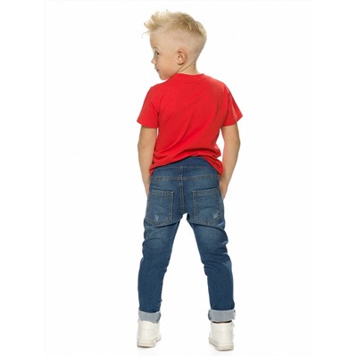 Джинсы для мальчиков с начёсом и 5-ю карманами, небольшого объёма, зауженные книзу, пояс из рибаны с внутренней регулировкой ширины, по боковому шву лампас из репсовой тесьмы с надписью Подписывайся играть в игры, локальный принт с надписью Бери от жизни всё!