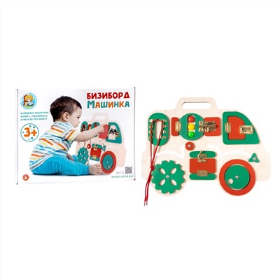 Каждый родитель хочет, чтобы его ребёнок вырос умным и сообразительным. Наша деревянная игрушка Бизиборд «Машинка» призвана помочь в этом! Состав: • бизиборд – 1 шт. Предназначено для детей от 3 лет. Как играть? Развивающая доска для детей разработана по методике Марии Монтессори и представляет собой фанеру, на которой расположено множество интересных элементов, окружающих нас в быту: колесики, замочки, шнуровка, щеколда, дверки и др. Это самый настоящий развивающий центр для малыша, который займёт его на долгое время и отвлечёт от всех других занятий и игрушек. Задача ребёнка во время игры в бизиборд – исследовать все мелкие детали, прикреплённые к доске, понять опытным путём, для чего они нужны, запомнить тактильные ощущения и найти решение к каждой головоломке. У нашего бизиборда удобная форма, есть ручка для переноски, доска сделана из натуральных материалов. Бизиборд «Машинка» развивает мышление, логику, память, сообразительность, мелкую моторику, тактильные ощущения и усидчивость. Смотрите другие развивающие доски на нашем сайте в разделе «Бизиборды».