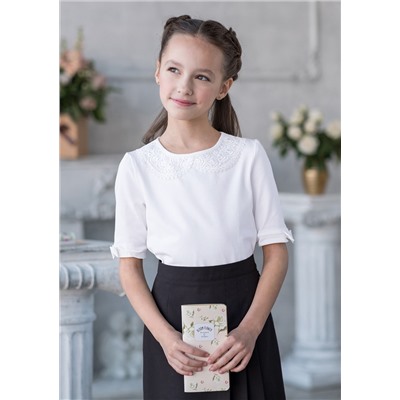 Трикотажная блузка выполнена из кулирной глади качества пенье(самое высокое).Рукав три четверти заканчивается очаровательным,маленьким, игривым бантиком. Горловина украшена красивым ажурным воротником белого цвета. Для удобства на спинке предусмотрена застёжка на пуговицу. Модель для девочек младшего школьного возраста.