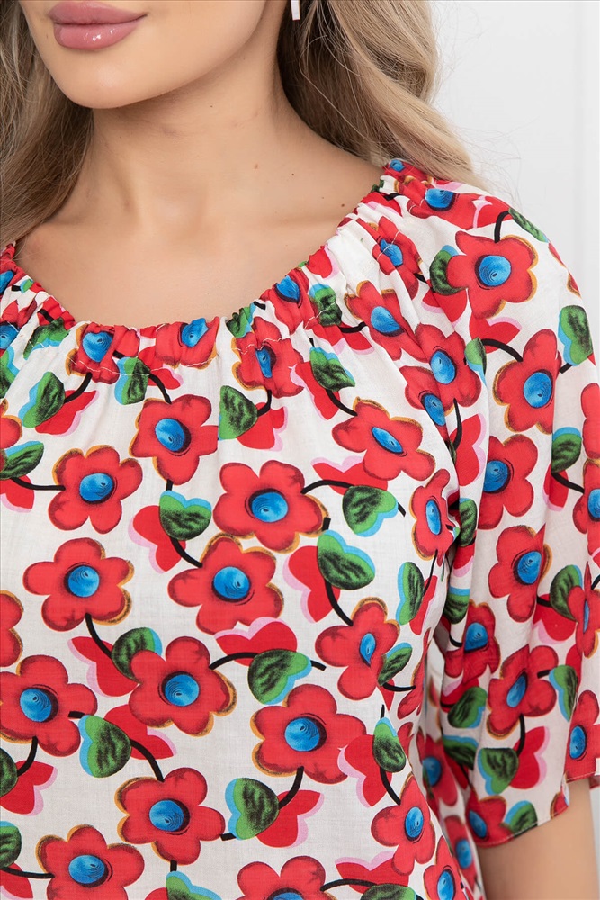 В этом сезоне абсолютно все дизайнеры предлагают открывать одну из самых женственных частей тела - плечи и ключицу. Блуза свободного кроя, горловина обработана резинкой, что позволяет спустить ее на плечи. Рукав три четверти, по низу свободный. В комплект входит пояс из основной ткани, который отлично подчеркнет линию талии!
