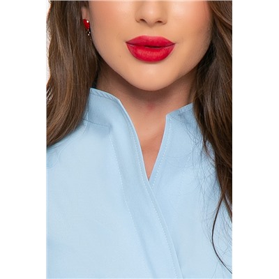 Артикул:Б4184. Ткань:блузочная. Состав:100% п/э. Цвет:голубой. Вид застежки:кнопки. Силуэт:полуприталенный. Карманы:отсутствуют. Тип горловины:стойка. Длина изделия по спинке:44/ 68 см, 46/ 69,5 см, 48/ 70,5см, 50/ 72 см, 52/ 73,5 см, 54/ 75 см, 56/ 76,5 см. Рост модели:167 см. Дизайнерская блуза асимметричного кроя, которая поможет создать стильный деловой образ. Можно сочетать с разнообразным низом: брюками, джинсами или юбкой. Шикарный, пышный, длинный рукав, собран внизу манжетой на кнопках. Блуза скроена на запах, фиксируется на двух кнопках по переду. В комплект входит пояс из основной ткани, подчёркивающий линию талии. Уход за изделием: бережная стирка до 30 градусов, нельзя отбеливать, деликатный отжим, гладить при t не более 110С, гладить с изнанки. *Допуск отклонения длины при массовом производстве 1-3 см является нормой.
