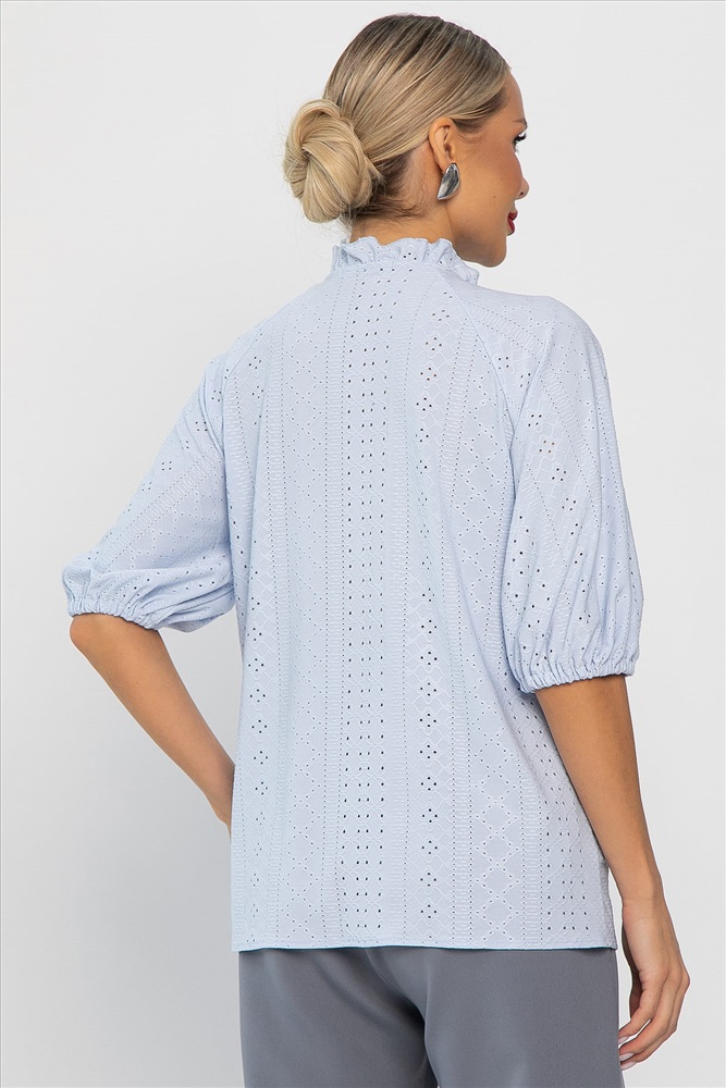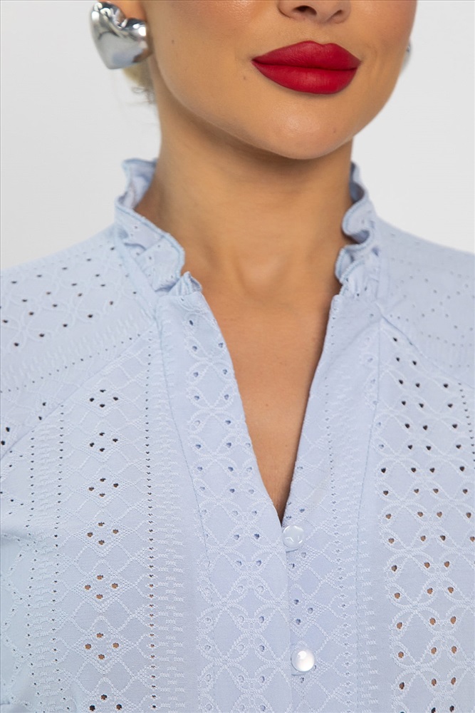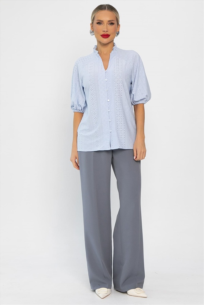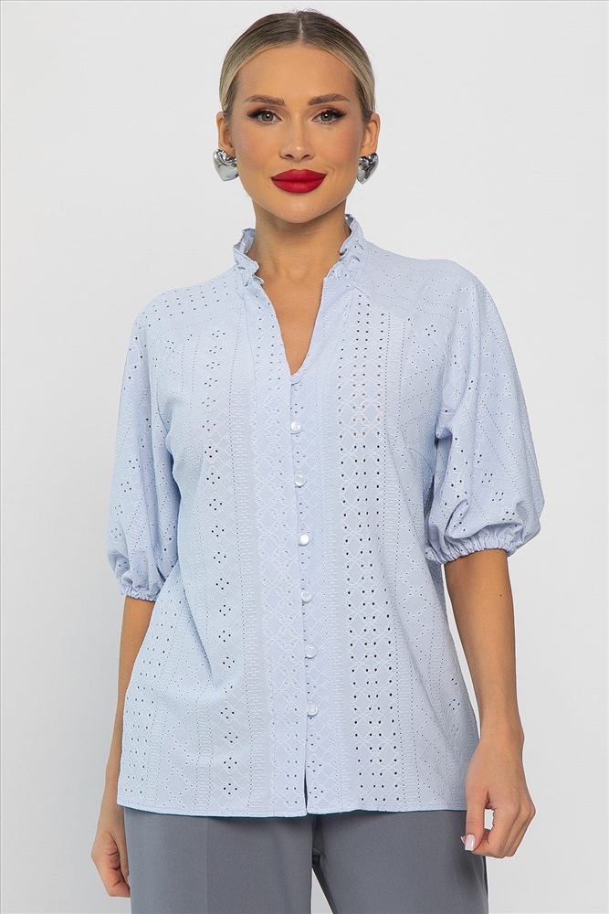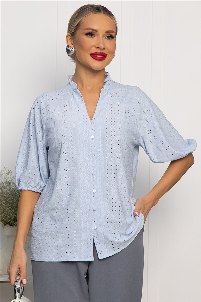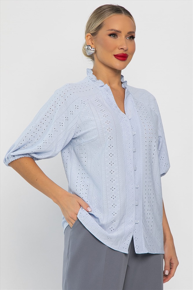 Эта изысканная блузка в голубом цвете станет идеальным дополнением вашего гардероба. Изготовленная из легкого и дышащего материала, она обладает элегантным дизайном с изящными вырезами, что придает ей утонченный и романтичный вид. Короткие рукава добавляют игривости, а пуговицы по всей длине создают классическую атмосферу. Блузка отлично сочетается как с брюками, так и с юбками, что делает её универсальным вариантом для повседневной носки или особых случаев.