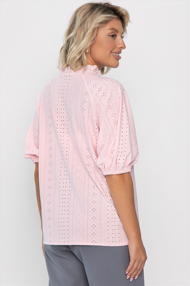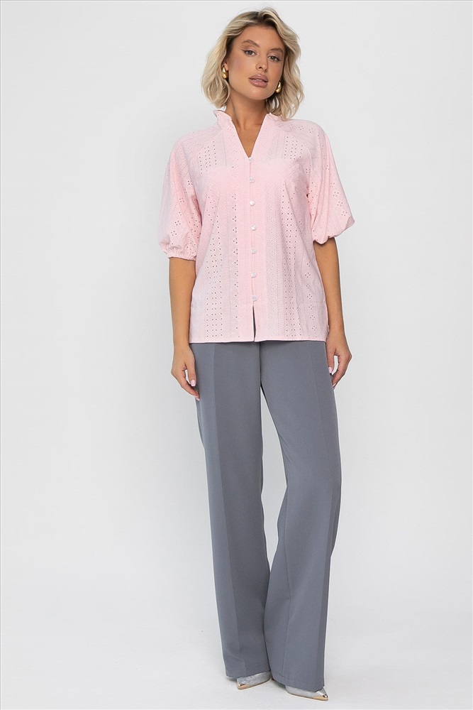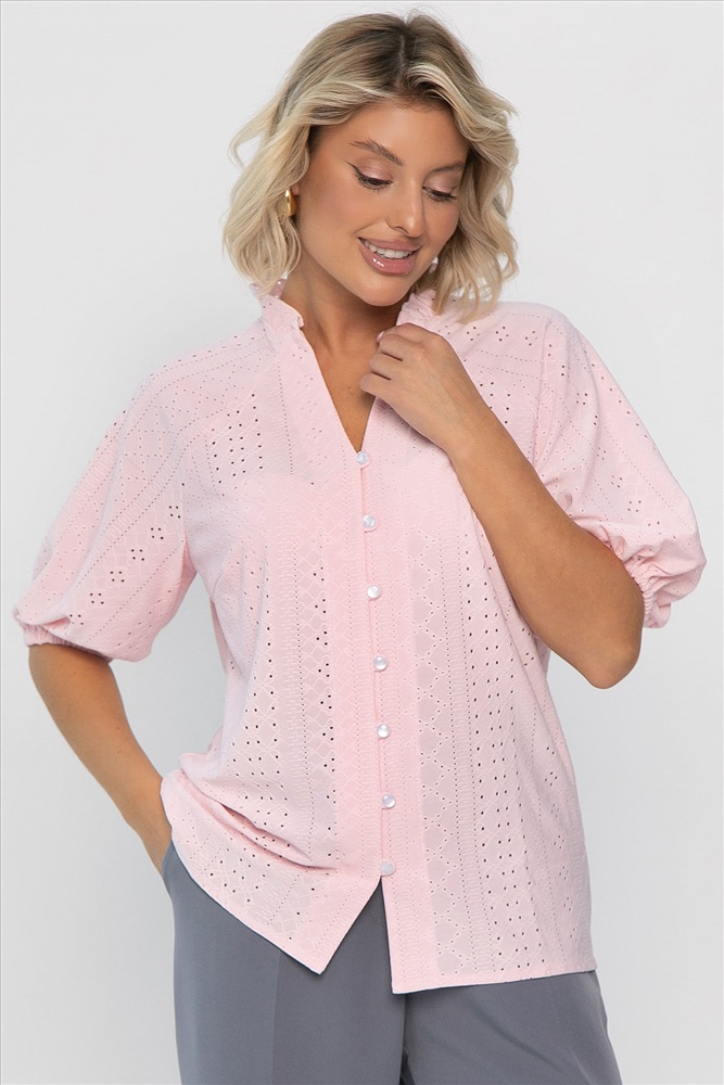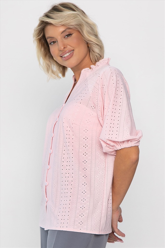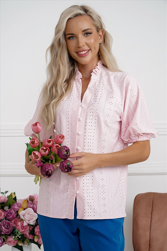 Эта изысканная блузка в красивом розовом цвете станет идеальным дополнением вашего гардероба. Изготовленная из легкого и дышащего материала, она обладает элегантным дизайном с изящными вырезами, что придает ей утонченный и романтичный вид. Короткие рукава добавляют игривости, а пуговицы по всей длине создают классическую атмосферу. Блузка отлично сочетается как с брюками, так и с юбками, что делает её универсальным вариантом для повседневной носки или особых случаев.