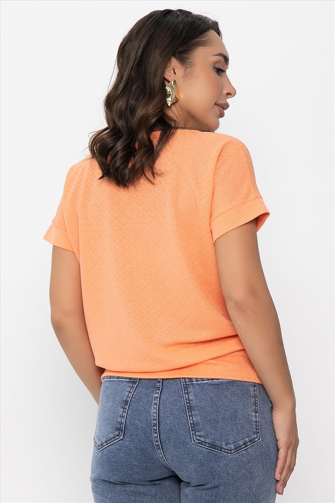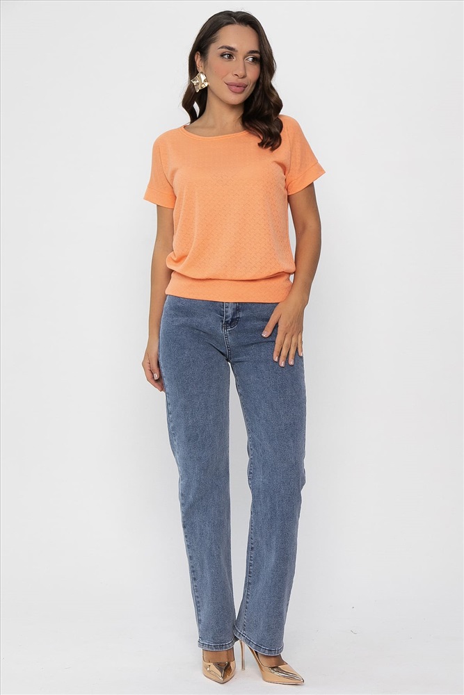 Встречайте изысканную блузку в оранжевом цвете. Этот элемент гардероба станет вашим универсальным спутником. Свободный крой обеспечивает удобство и свободу движений, а круглый вырез добавляет образу элегантности. Спущенный рукав с притачной манжетой придает модели особый шарм. Низ блузы на широкой ножке.