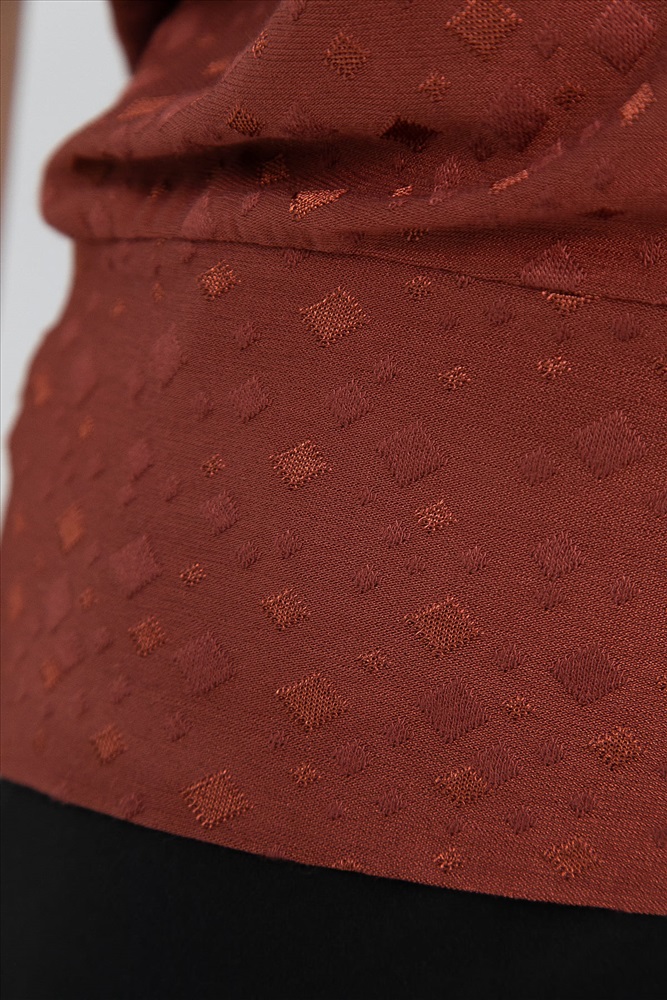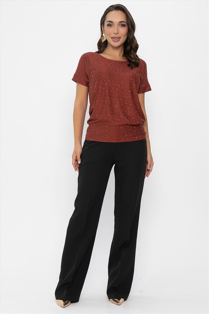 Встречайте изысканную блузку в терракотовом оттенке. Этот элемент гардероба станет вашим универсальным спутником. Свободный крой обеспечивает удобство и свободу движений, а круглый вырез добавляет образу элегантности. Спущенный рукав с притачной манжетой придает модели особый шарм. Низ блузы на широкой ножке.