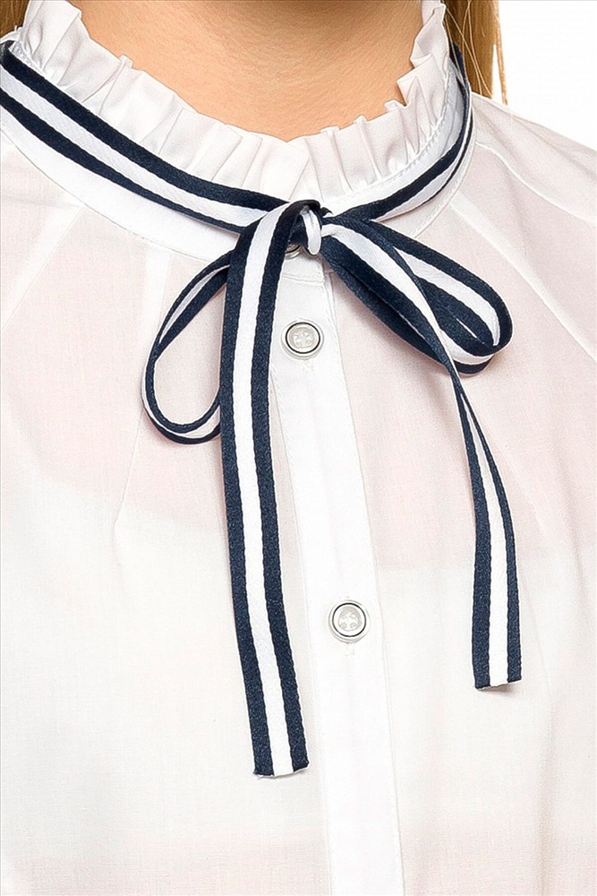 ID товара: 308651 Состав: Хлопок 60%, Полиэстер 40% Сезон: Демисезон Длина: Средняя Фасон: Прямой Рукав: Короткий Вид застежки: Пуговицы Вырез горловины: Стоечка Рисунок: нет Тип карманов: Без карманов Декоративные элементы: Бант Основная ткань: Хлопок Стиль: классический Страна бренда: Россия Страна производства: Китай Блузка для девочек полуприлегающего силуэта с рельефами по спинке и переду. Рукав фонарик по низу фиксируется узкой манжетой из декоративной тесьмы. Воротник стойка с рюшей по верхнему краю декорирован съёмной сатиновой тесьмой, которая продета в шлёвки по спинке воротника. Спереди от стойки расходятся декоративные лучи вытачки. Комментарии к товару