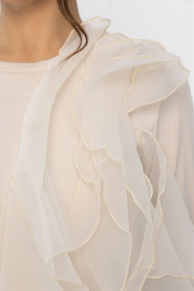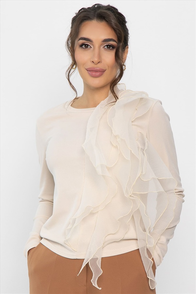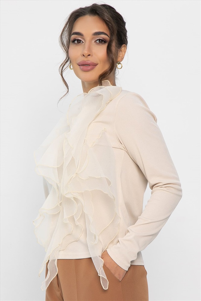 Блуза из трикотажного материала «Лапша» с воланами из органзы и длинными рукавами — это прекрасное дополнение к вашему гардеробу! Она станет ярким акцентом как для особых случаев, так и для повседневных выходов. Воланы придают образу лёгкость и романтичность. С этой блузой вы сможете создать стильный и запоминающийся образ!