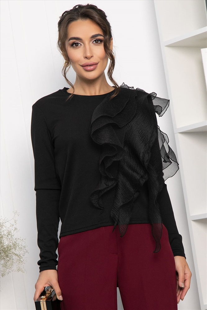 Блуза из трикотажного материала «Лапша» с воланами из органзы и длинными рукавами — это прекрасное дополнение к вашему гардеробу! Она станет ярким акцентом как для особых случаев, так и для повседневных выходов. Воланы придают образу лёгкость и романтичность. С этой блузой вы сможете создать стильный и запоминающийся образ!