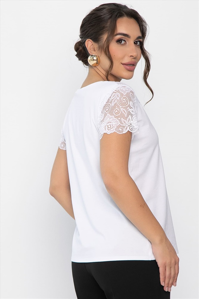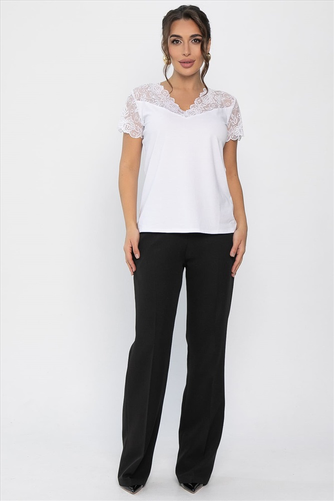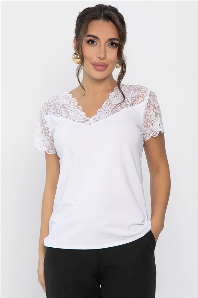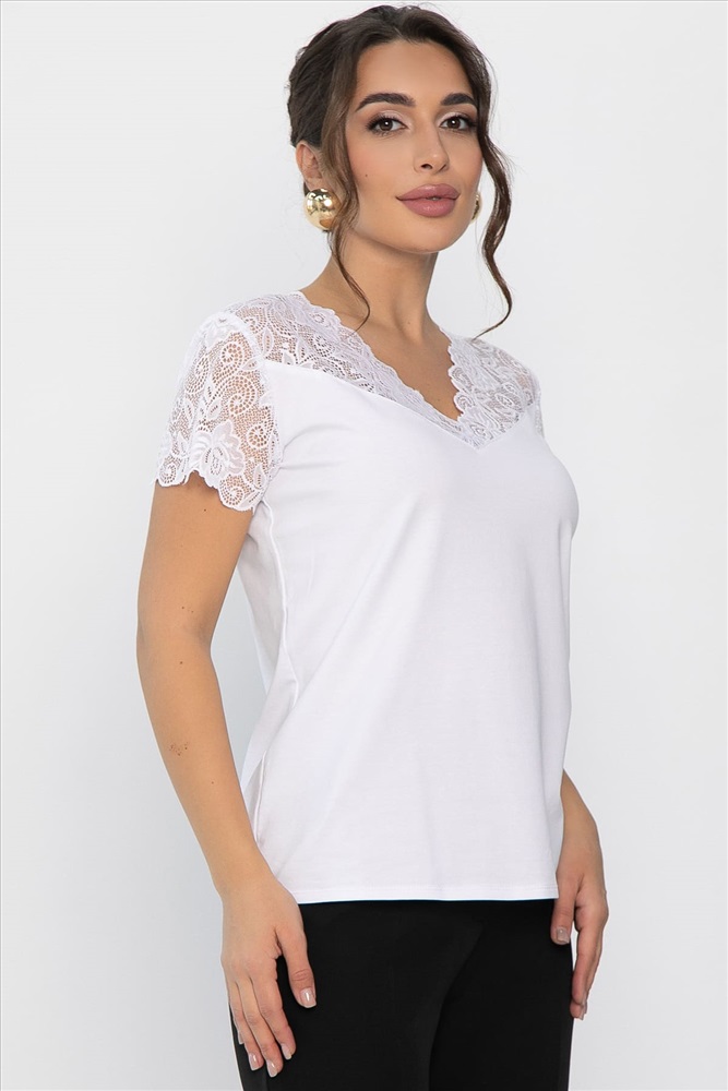Блузка с изящными кружевными деталями — это превосходный выбор для тех, кто хочет выглядеть элегантно и чувствовать себя комфортно. Рукав блузки укороченный, выполнен из кружева. Горловина имеет V-образную форму. Блузку можно носить как самостоятельный элемент, так и комбинировать с жакетами, кардиганами или пиджаками. Этот универсальный элемент гардероба прекрасно подходит для деловых брючных костюмов, юбок-карандаш, джинсов и вечерних нарядов. Он добавит вашему образу изысканности и уверенности.