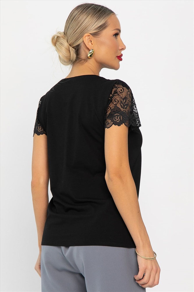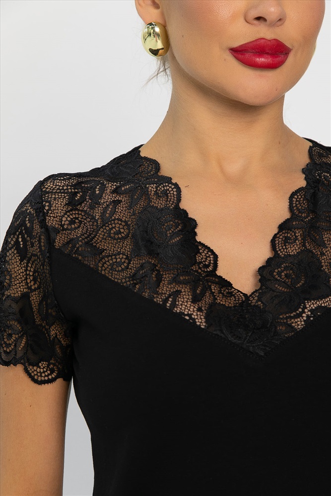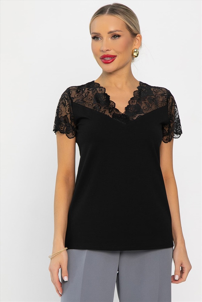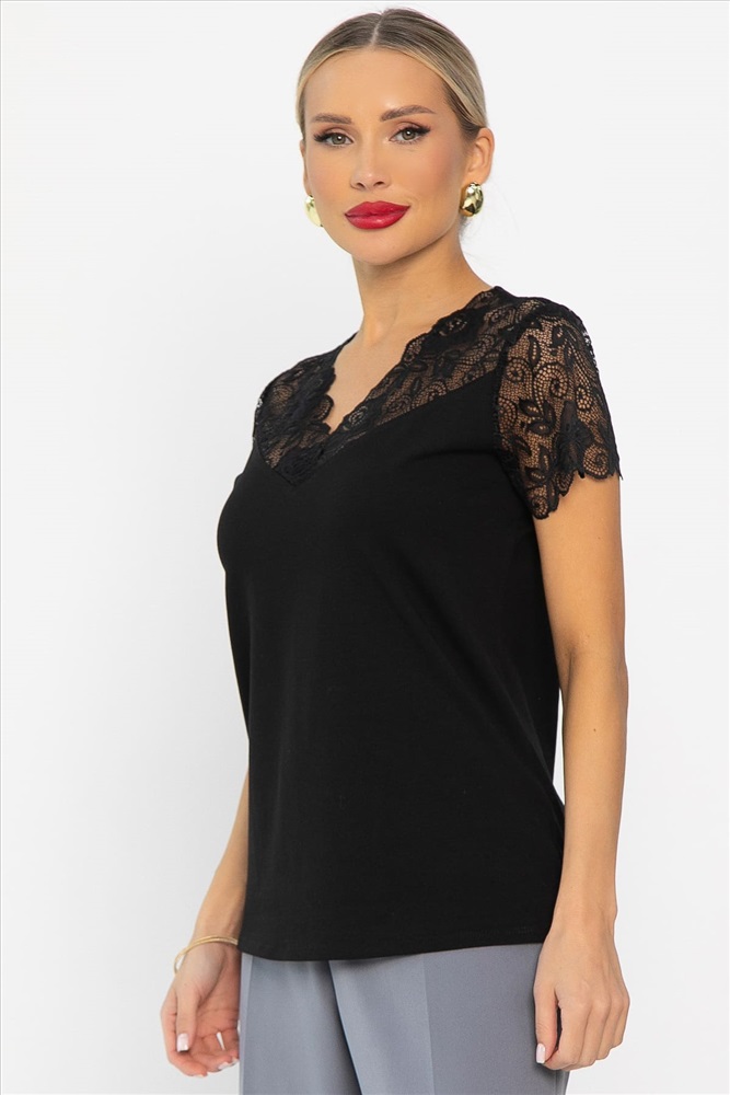 Блузка с изящными кружевными деталями — это превосходный выбор для тех, кто хочет выглядеть элегантно и чувствовать себя комфортно. Рукав блузки укороченный, выполнен из кружева. Горловина имеет V-образную форму. Блузку можно носить как самостоятельный элемент, так и комбинировать с жакетами, кардиганами или пиджаками. Этот универсальный элемент гардероба прекрасно подходит для деловых брючных костюмов, юбок-карандаш, джинсов и вечерних нарядов. Он добавит вашему образу изысканности и уверенности.