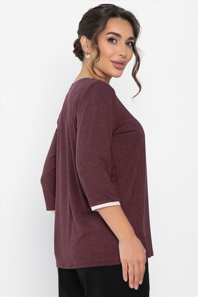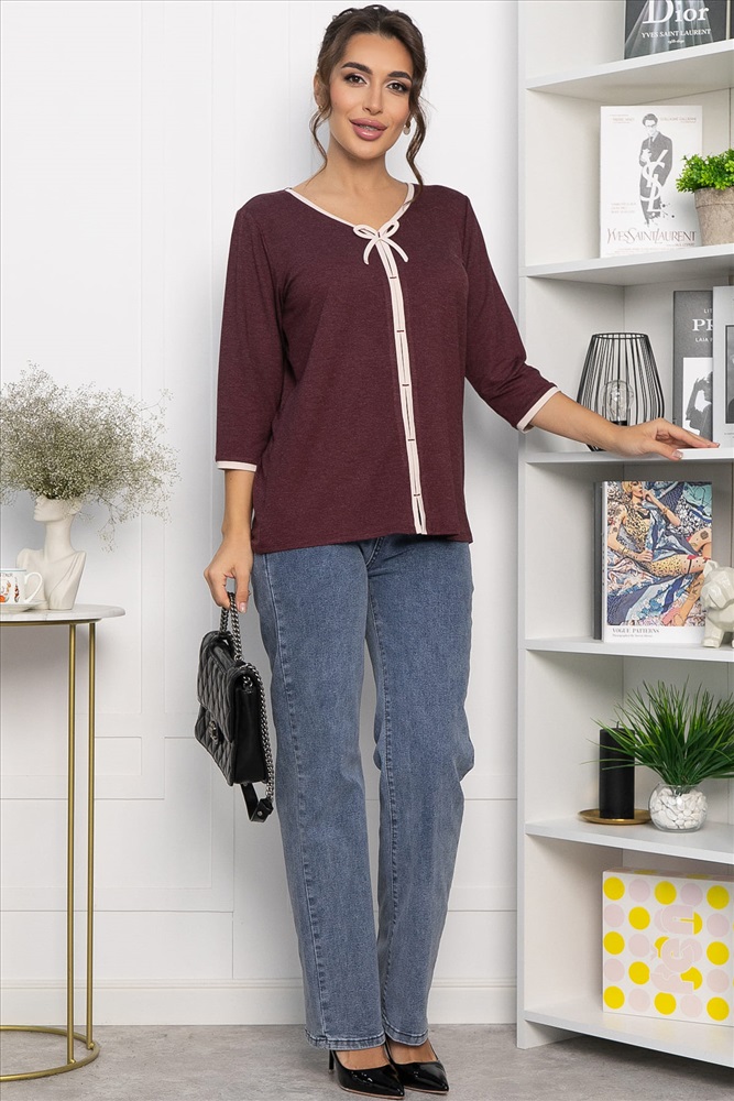 Блузка в ягодном оттенке — это прекрасный вариант для тех, кто стремится выделиться и подчеркнуть свою утончённость. Благодаря длине рукава три четверти, образ выглядит современно и стильно. V-образный вырез горловины дополнен контрастным кантом, который переходит в планку. Планка украшена стразами. Эта блузка — превосходный выбор для создания яркого и запоминающегося образа, который будет привлекать восхищённые взгляды.