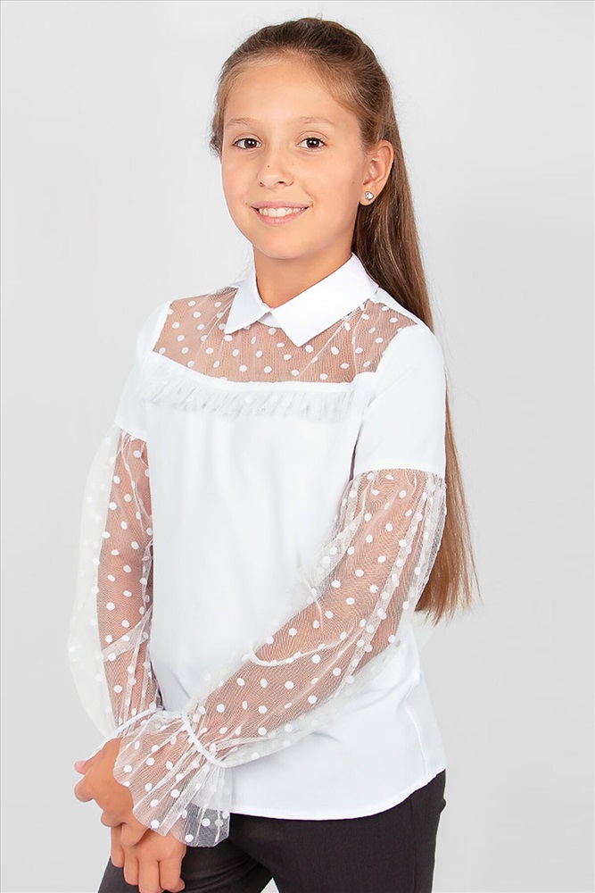 ID товара: 876091 Состав: 70% Вискоза, 25% Нейлон, 5% Спандекс Сезон: Демисезон Длина: Средняя Фасон: Прямой Рукав: длинные Вырез горловины: Отложной воротничок Рисунок: Горох Декоративные элементы: Рюши Основная ткань: Вискоза Стиль: классический Страна бренда: Россия Страна производства: Россия Блузка СольПерец. Подростковая блузка белого цвета с отложным воротником. Рукава и передняя полочка выполнены из фатина. Состав материала: 70% - вискоза, 25%-нейлон, 5%-спандекс. Комментарии к товару