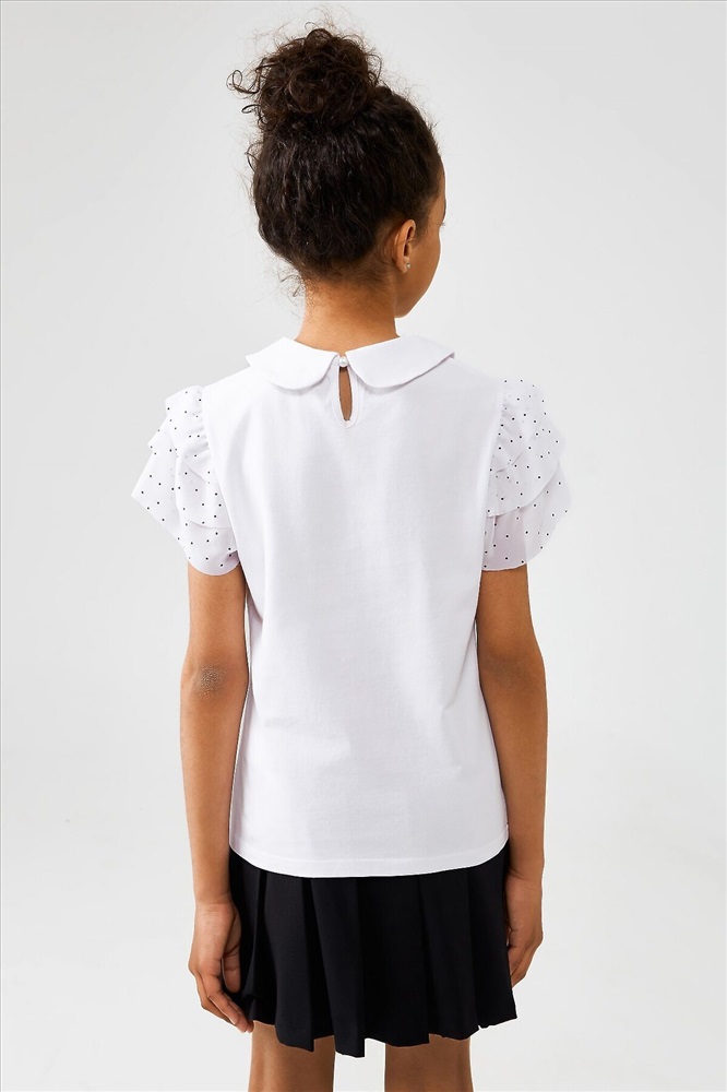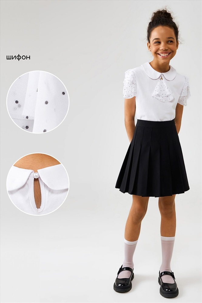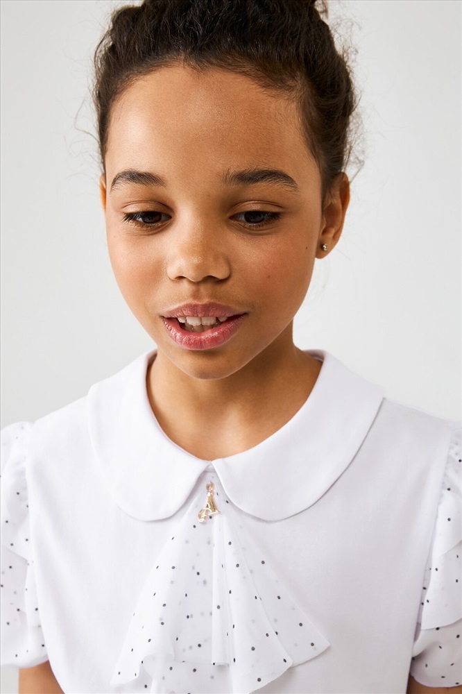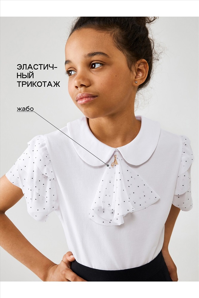 ID товара: 1039664 Состав: 95% Хлопок, 5% Полиуретан Сезон: Демисезон Длина: Средняя Фасон: Полуприлегающий Рукав: короткие Вид застежки: Пуговица Вырез горловины: Отложной воротничок Декоративные элементы: Жабо Основная ткань: Хлопок Стиль: классический Страна бренда: Россия Страна производства: Китай Блузка детская для девочек Viviana белый Комментарии к товару