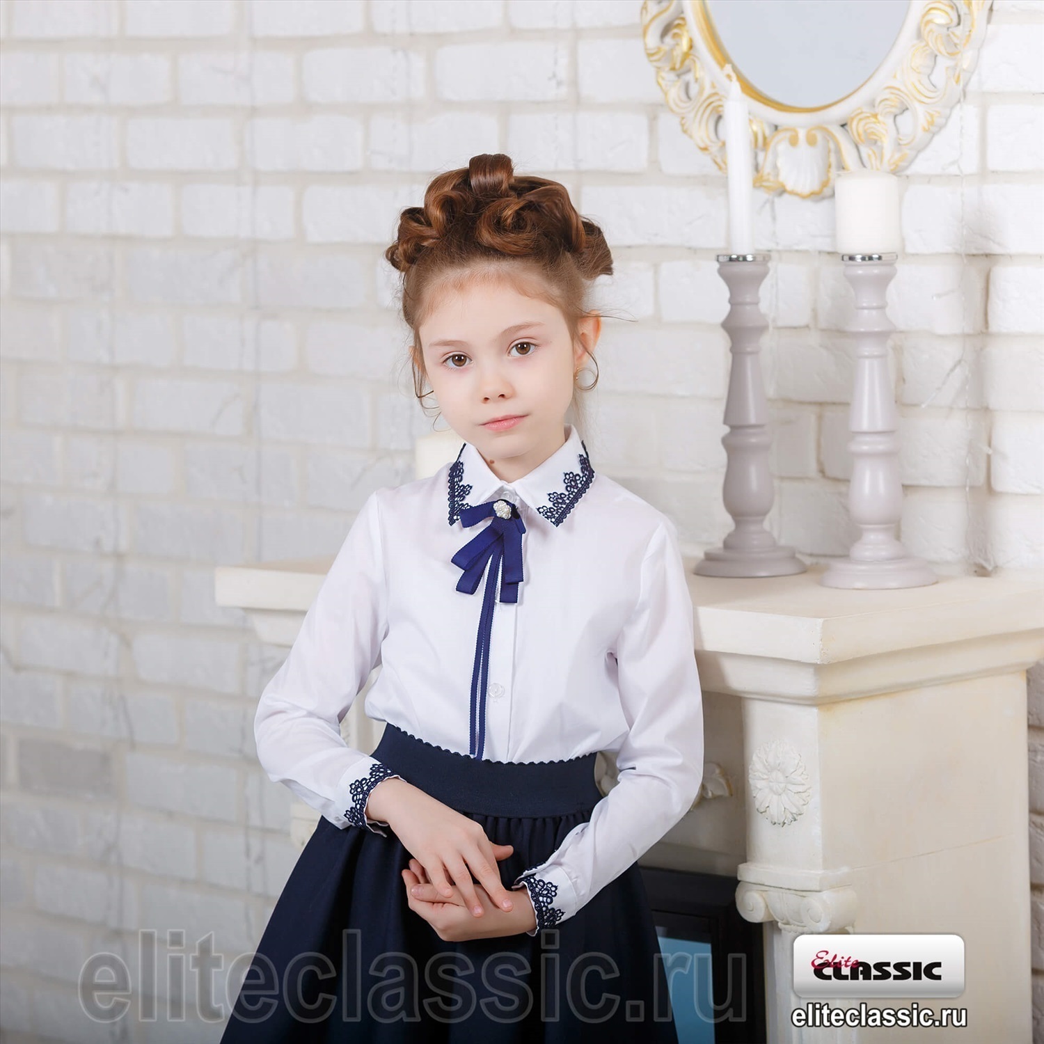 Блузка для школьниц младших классов, прямого силуэта, выполнена из хлопковой блузочной ткани белого цвета. Воротник отложной. Рукав длинный одношовный, низ рукава на манжете, также по низу рукава располагаются защипы. По спинке располагается кокетка и встречная складка, придающая свободу движениям. Застёжка центральная на пяти обмётанных петлях и пяти пуговицах. Воротник и манжеты расшиты темно-синим кружевом, что придает изделию элегантность. Брошка приобретается отдельно! Покрой: прямой Воротник: отложной с острыми концами Вид рукава: рукав длинный, низ рукава на манжете Вид застёжки: центральная на пяти обмётанных петлях и пяти пуговицах Детали одежды: воротник и манжеты расшиты темно-синим кружевом Уход за вещами: бережная стирка при t° не более 30°С, гладить при t° не более 110°С, гладить с изнанки, деликатный отжим, отбеливание запрещено, сушка в вертикальном положении.