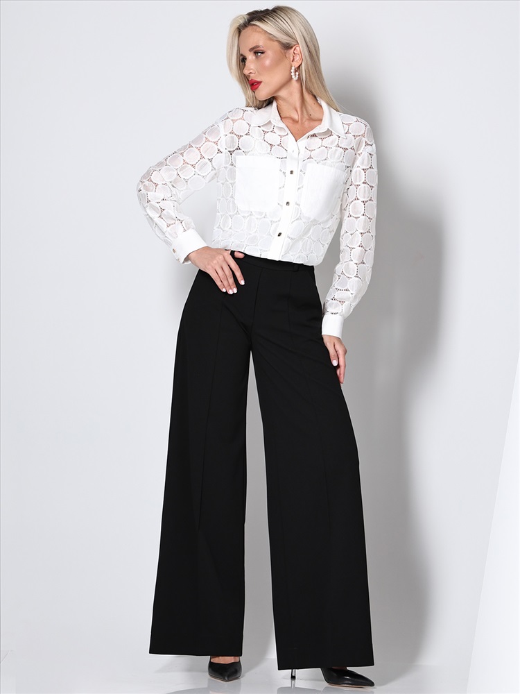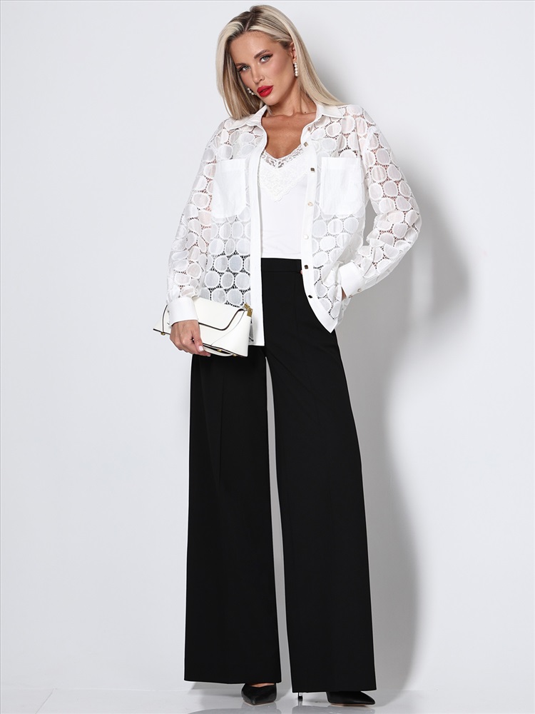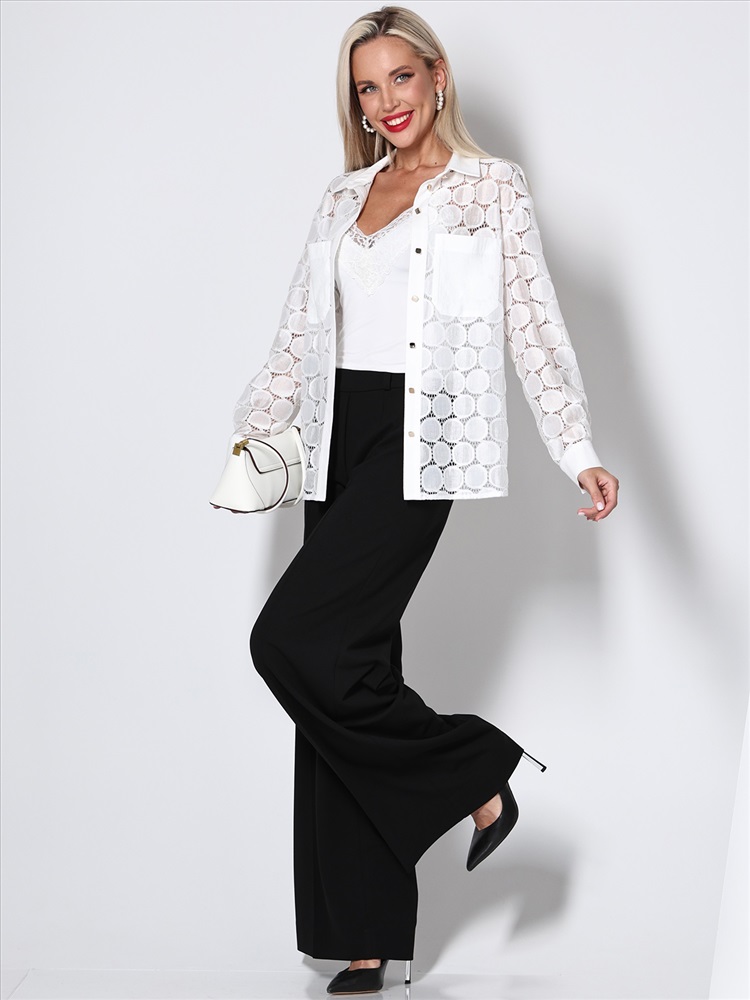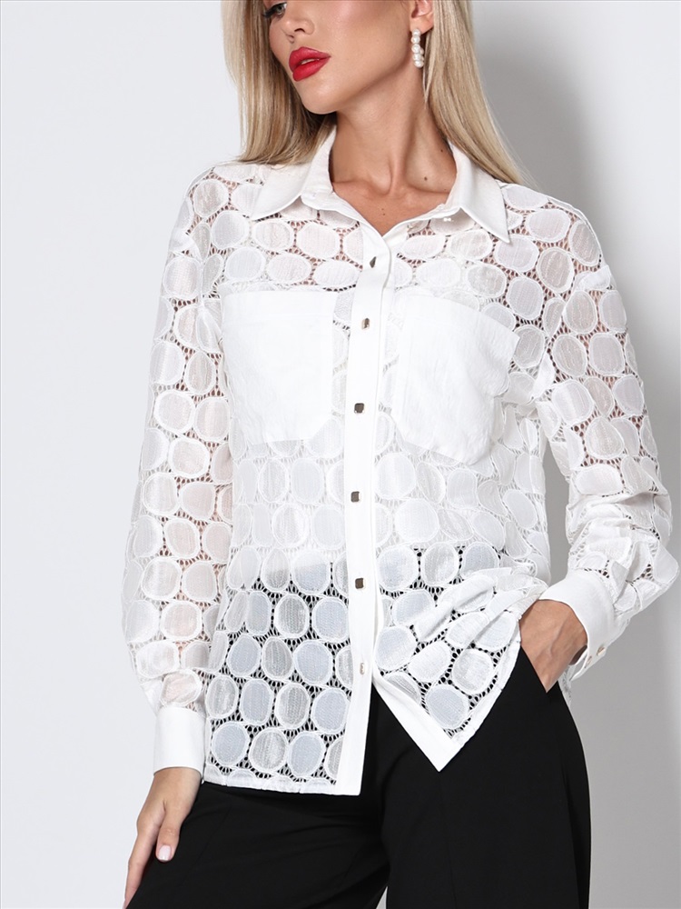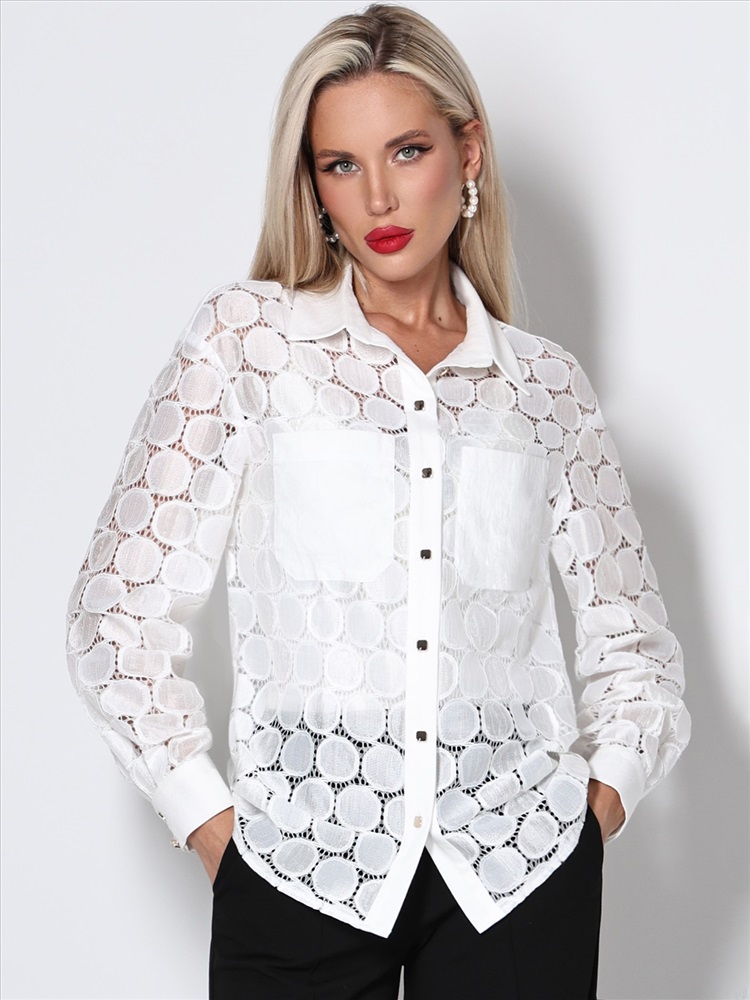 Декоративные элементы: Накладные карманы Вид застёжки: Пуговицы Вырез горловины: Рубашечный воротник Длина изделия по спинке: 65 Назначение: Повседневная Тип рукава: Длинный Уход за вещами: Бережная стирка при 30 градусах Фактура материала: Трикотажный Состав: 65% полиэстер, 30% вискоза, 5% эластан Тип ткани: кружево Цвет: Белый Блузка отличается уникальным дизайном кружева, который не оставит без внимания, добавит шарма вашему образу приковывая взгляды окружающих. Особенностью данной модели являются легкость и изысканность ткани, делая рубашку идеальным выбором для офисного стиля. Кружевная модель будет прекрасным выбором на любое торжество, а так же деловые встречи. Блузка офисная нарядная представляет собой изысканный и элегантный элемент женского гардероба, идеально подходящий для делового образа. Большой размерный ряд порадуют полных женщин. Винтажный стиль подчеркнет ваши достоинства фигуры. С такой блузкой вы всегда будете выглядеть стильно, красиво и модно. Длина: 44 размер - 65 см 46 размер - 65 см 48 размер - 66 см 50 размер - 66 см 52 размер - 67 см 54 размер - 67 см Бережная стирка при 30 градусах Цвет изделия на фотографии может отличаться от фактического товара, что связано с искажением цветопередачи монитором, настройками фотоаппаратуры и прочими факторами Пропорции