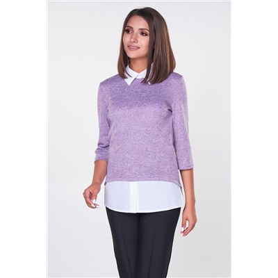 Необычная блуза полуприлегающего силуэта с имитацией рубашки. Втачные рукава ¾. Горловина оформлена отложным воротником на стойке. Сзади находится застежка на петлю и пуговицу. Воротник и нижняя часть изделия выполнены из блузочной ткани. Низ прямой, по бокам разрезы. Модель станет прекрасной основой для создания делового образа.