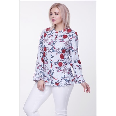 Блуза полуприлегающего силуэта с цветочным принтом. Длинные втачные рукава, книзу с воланами. Горловина оформлена воротником на стойке, переходящим в планку с застежкой на пуговицы. Низ блузы оформлен двумя рядами воланов, без разрезов. Блуза станет прекрасным дополнением к Вашему гардеробу.