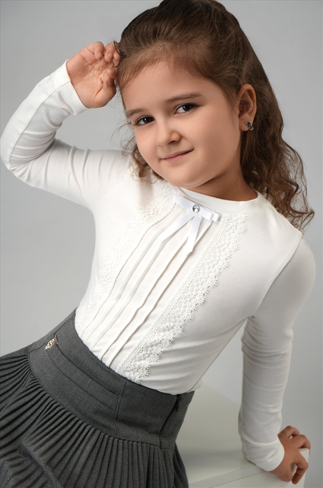 Преимущества: — мягкий трикотаж кулирная гладь: 92% хлопок, 8% эластан; — детская блузка с длинными рукавами приятна к телу, тянется и не сковывает движения; — изящное кружево добавляет лёгкости и утончённости; — аккуратный бантик с пуговкой создаёт нарядный акцент; — ровные вертикальные складки визуально вытягивают силуэт. Школьная блузка отлично сочетается с классическим низом. Для школы, утренника или первого звонка — всегда актуально, удобно и красиво! Модель Маша, ее рост 128, параметры: 64-59-72. На ней размер 134.