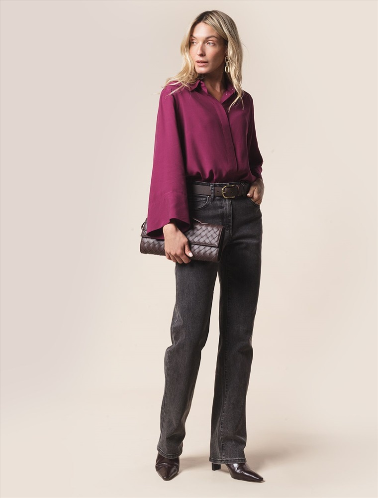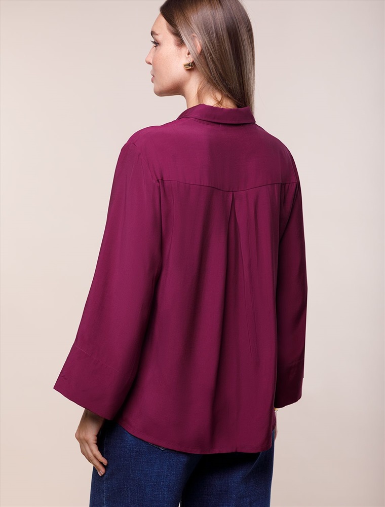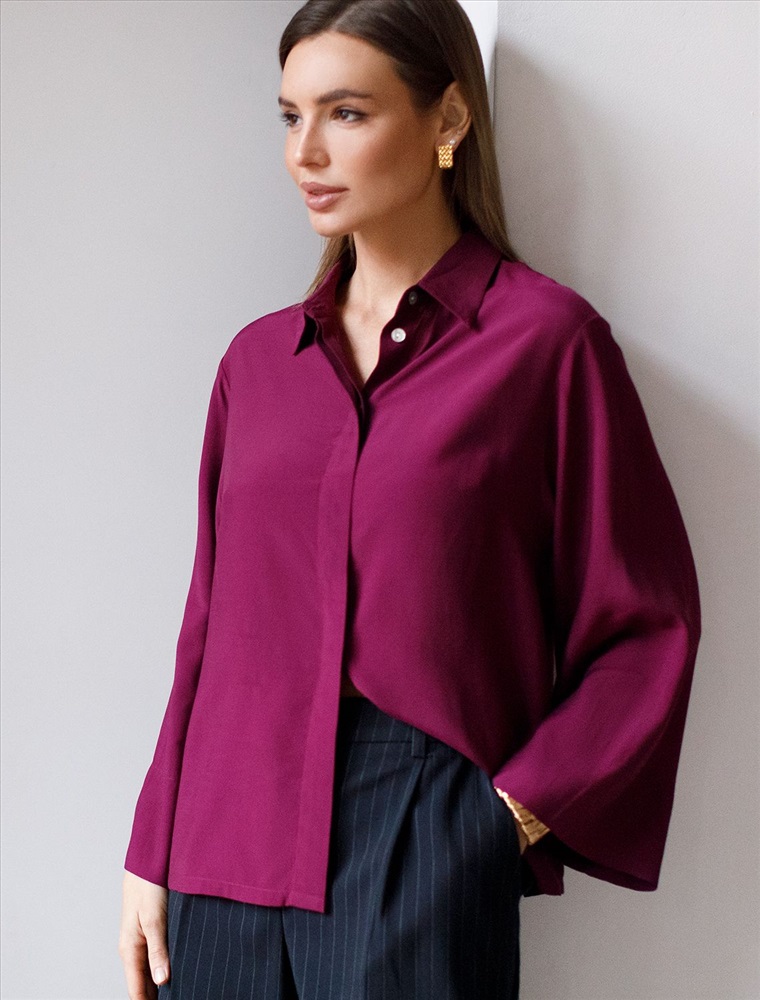 Блузка с отложным воротником и свободными укороченными рукавами выполнена из лиоцелла с вискозой. Лаконичная модель без декора, дополнена застежкой на пуговицы из натурального перламутра под планкой. Просторный крой не стесняющий движений подходит для любой фигуры с не широкими низами в заправку или поверх.