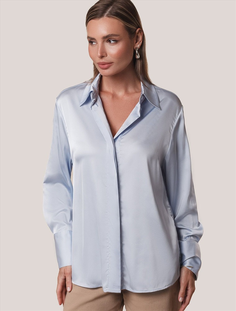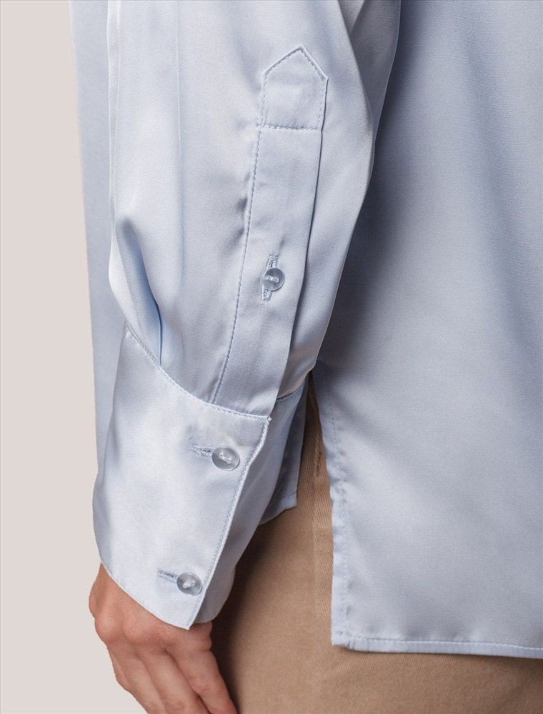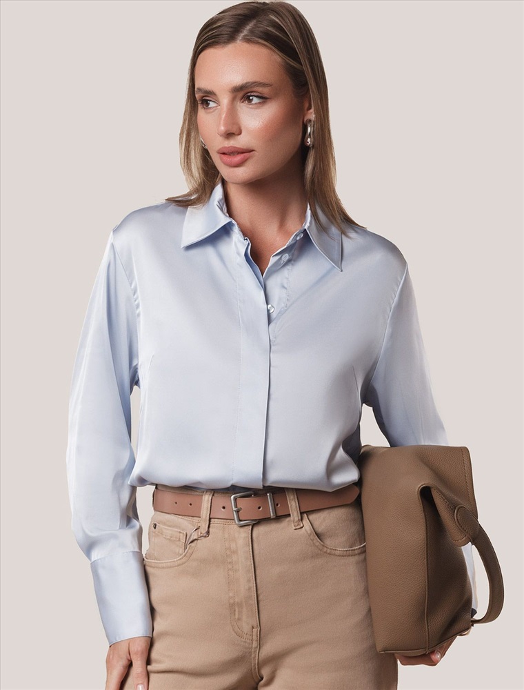 Плотность: 107 Г/м2 Параметры модели на первом фото: Рост 170, бюст 89, талия 63, бедра 92 Размер товара на первом фото: 42 Сатиновая блузка с эластаном в голубом цвете – воплощение элегантности и комфорта. Благородный блеск сатина добавляет образу шика, а эластичность материала гарантирует удобство при носке. Прямой силуэт блузки обеспечивает комфорт, а эластичность материала предотвращает деформацию. Застежка-планка с потайными пуговицами придает модели аккуратность. Универсальный вариант для casual-образов. Комментарии к товару