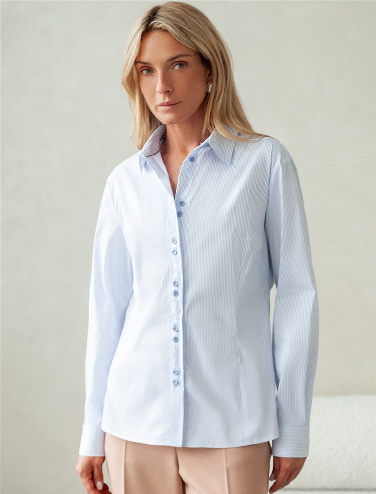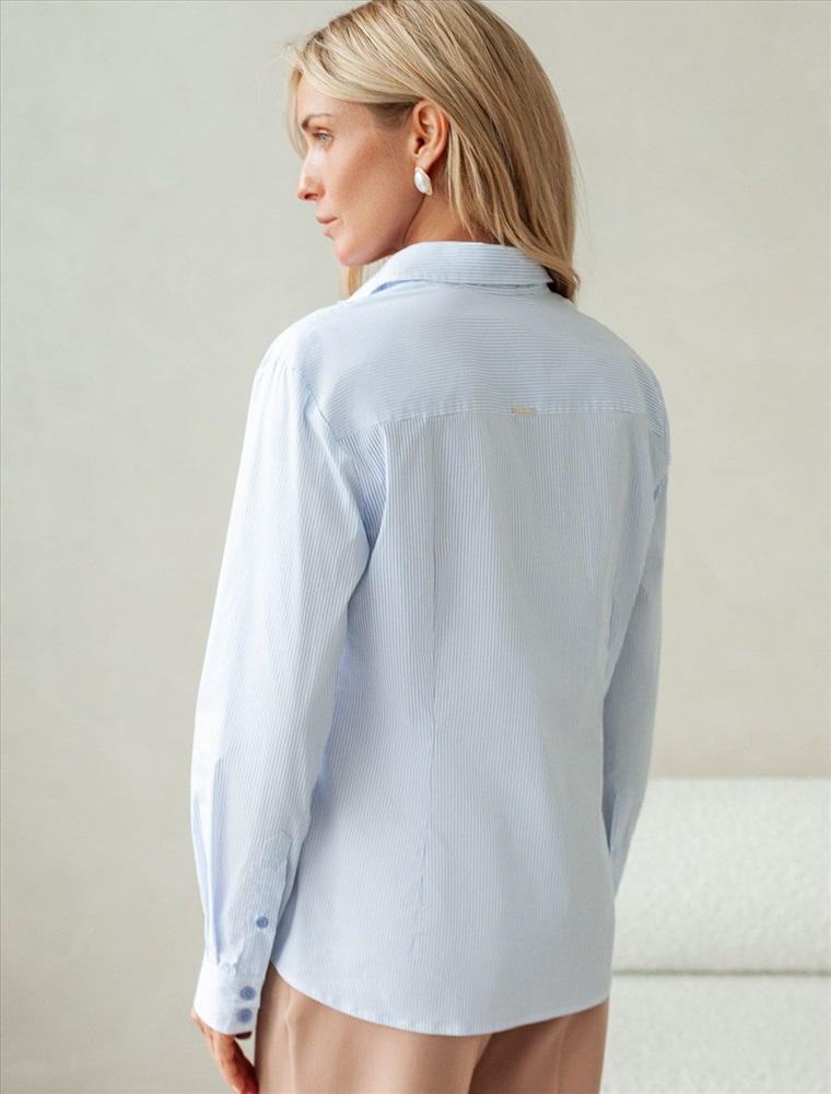 Плотность: 100 Г/м2 Параметры модели на первом фото: Рост 170, бюст 89, талия 63, бедра 92 Блузка прилегающего силуэта выполнена из формоустойчивого хлопка. Фишкой изделия служат парные контрастные пуговицы. На спинке фирменный металлический логотип бренда. Изделие хорошо держит форму, подчеркивает силуэт и подходит для любой фигуры. Идеальный вариант для респектабельных образов в деловом стиле. Комментарии к товару