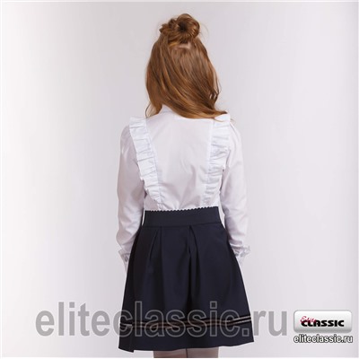 Блузка для девочек младших классов полуприлегающего силуэта. Воротник закругленной формы с отрезной стойкой. По переду отрезная планка. Рукав длинный на манжете, со сборкой по оканту. Перед и спинка с рельефами от плеча. Модель украшают рюши в рельефах и по шву манжета.