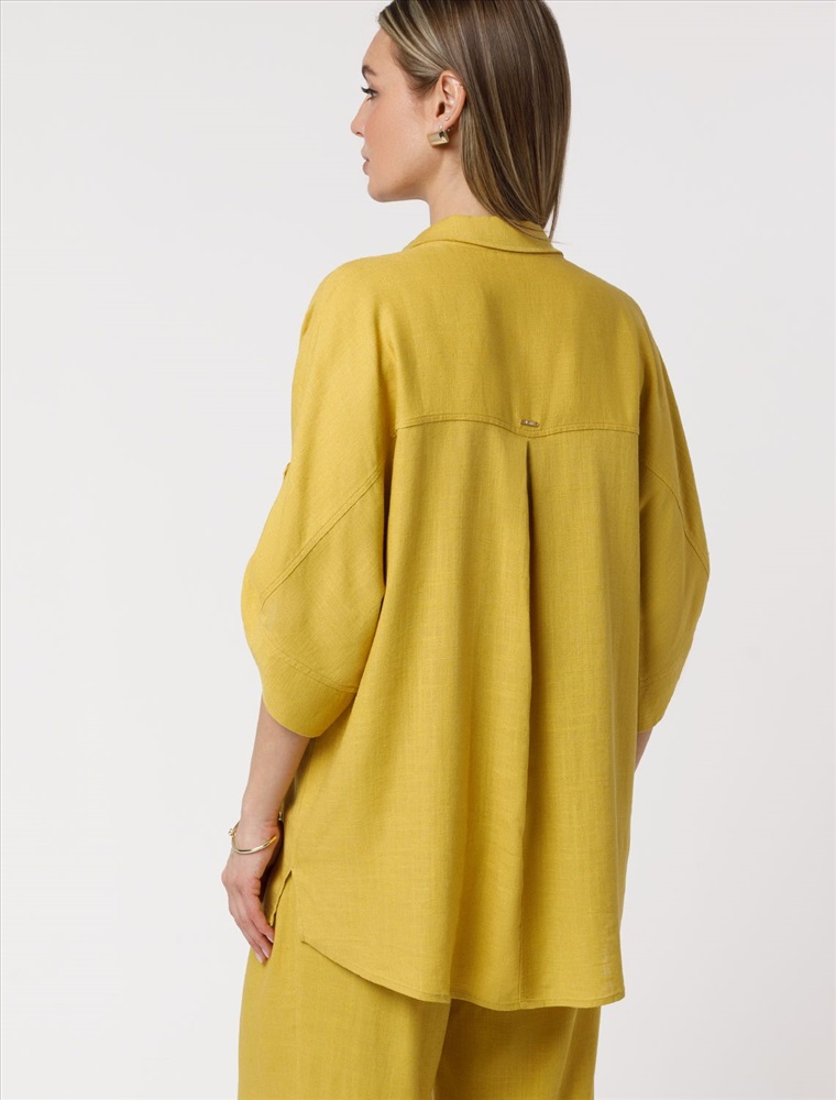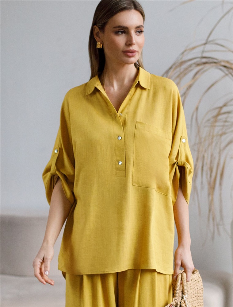 Блузка выполнена изо льна с вискозой. Модель с цельнокроеным рукавом с застежкой на пату дополнена сольным карманом и застежкой на пуговицы из натурального перламутра. Сочетается в костюме с брюками D24.222 и шортами D28.052. Ткань изящно струится, почти не мнется и сохраняет форму в течении долгого времени, обладает высокой воздухопроницаемостью, обеспечивая комфорт даже в самое жаркое время года.