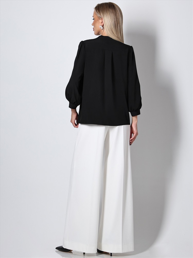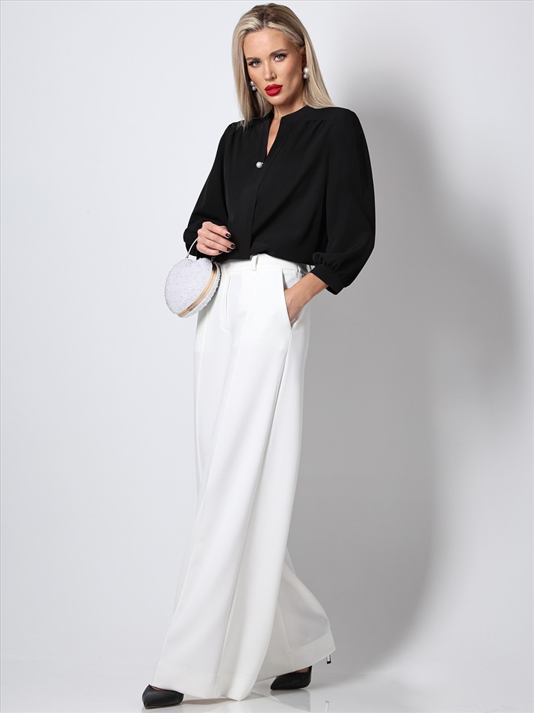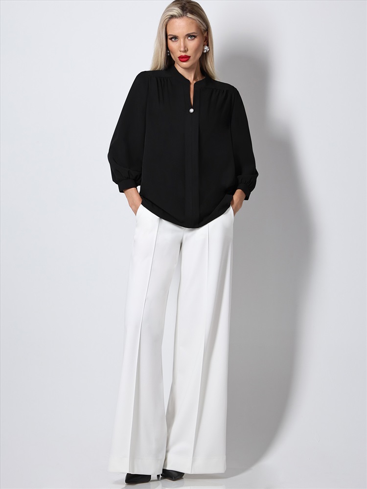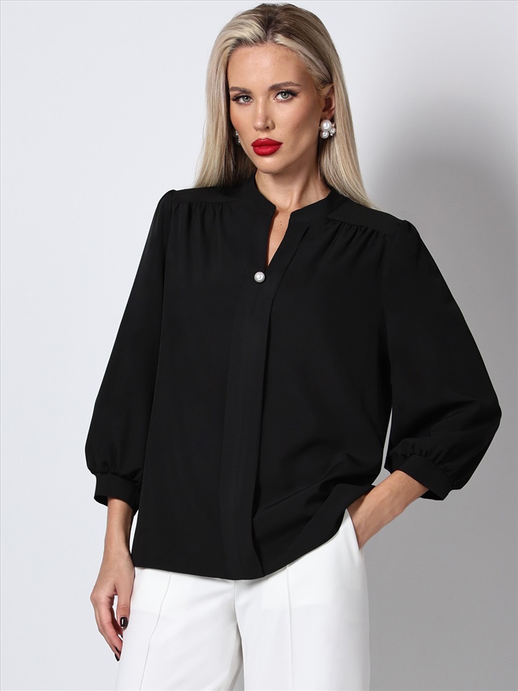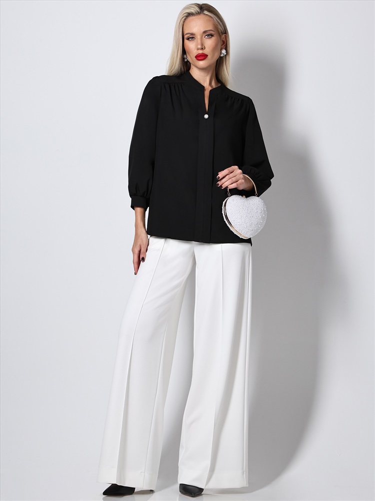 Женственная блузка на каждый день. Планки, имитирующие застежку, визуально делят фигуру и тем самым стройнят. Укороченный рукав с манжетом достаточно пышный, чтобы производить впечатление. Лучше всего будут смотреться в сочетании с юбками, но также можно носить ее навыпуск с брюками, а также длина позволяет гармонично дополнить ее поясом.