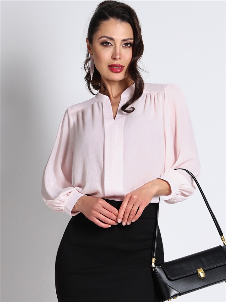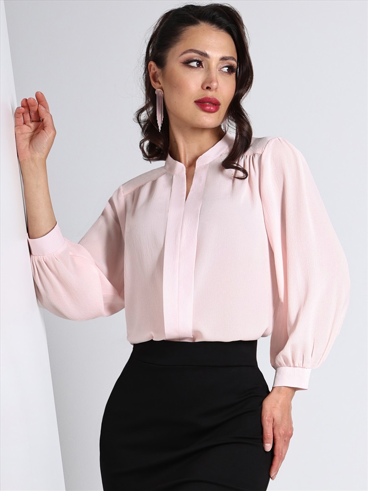 Женственная блузка на каждый день. Планки, имитирующие застежку, визуально делят фигуру и тем самым стройнят. Укороченный рукав достаточно пышный, чтобы производить впечатление. Лучше всего будут смотреться в сочетании с юбками, но также можно носить ее навыпуск с брюками, а также длина позволяет гармонично дополнить ее поясом.