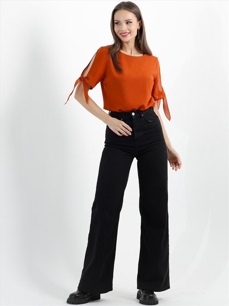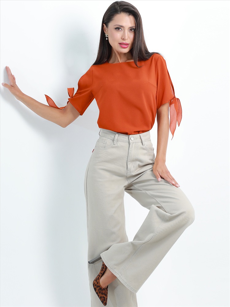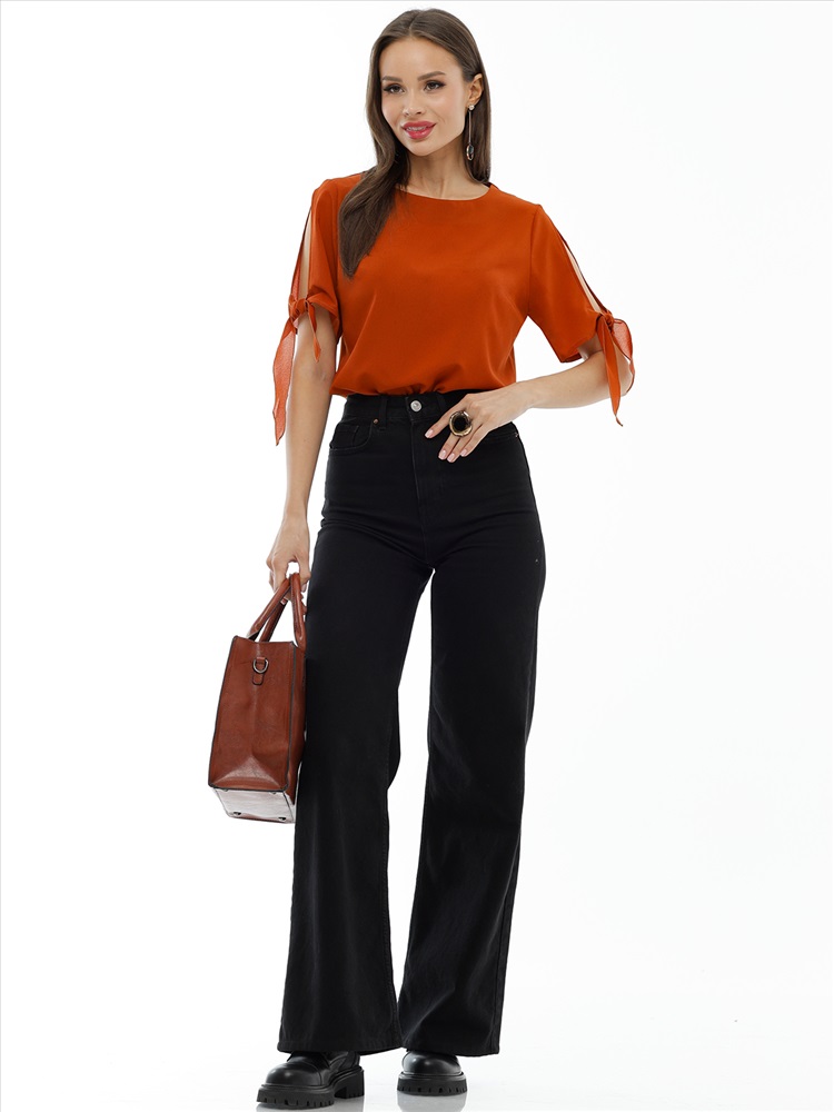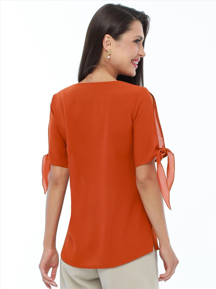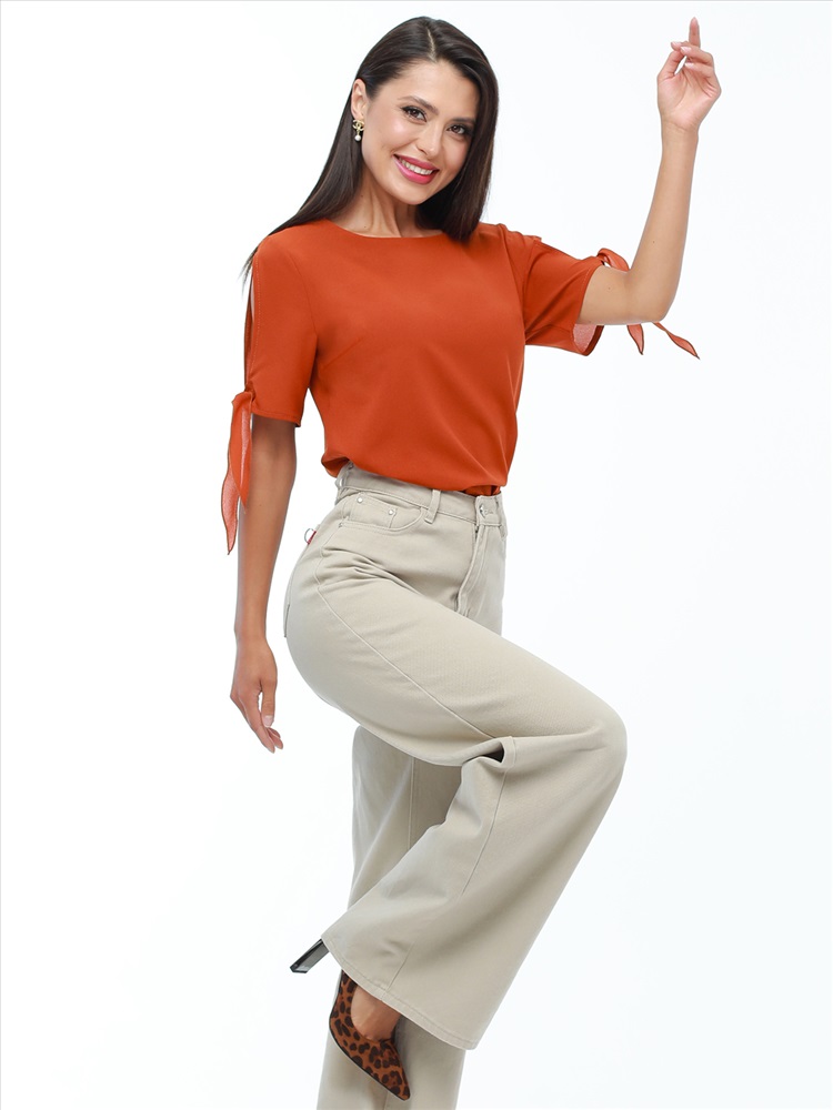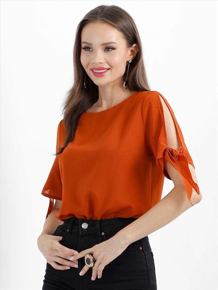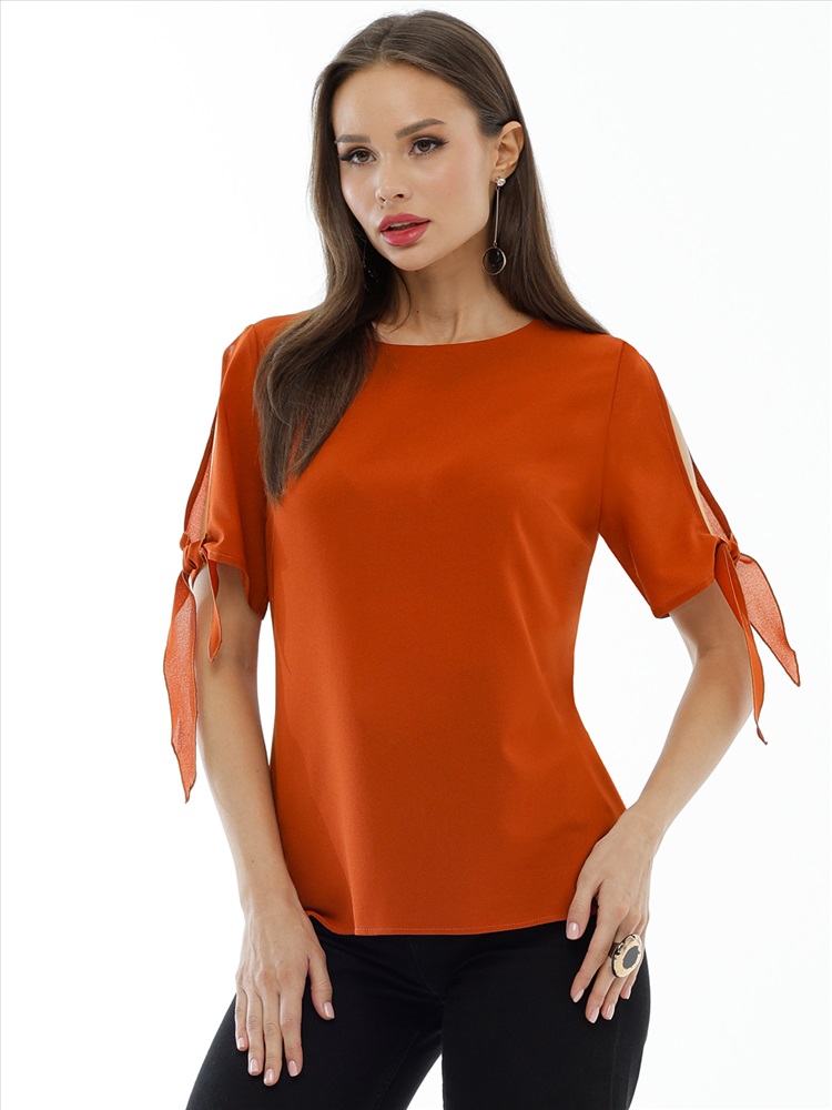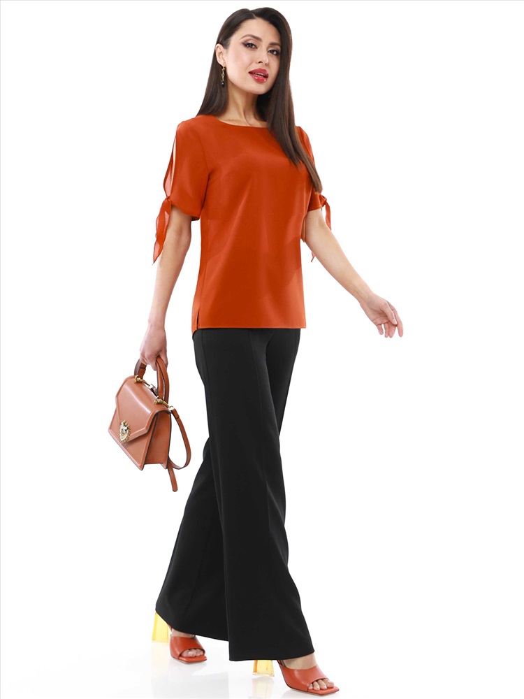 Легкая элегантная блузка из крепа для ваших летних образов. Свободный крой позволяет носить ее навыпуск и заправленной, сочетать с брюками и юбками. «Изюминка» блузки - короткий рукав с разрезом и завязками, которые не только позволят регулировать его ширину по вашей руке, но и сделают ваш повседневный образ более нарядным.