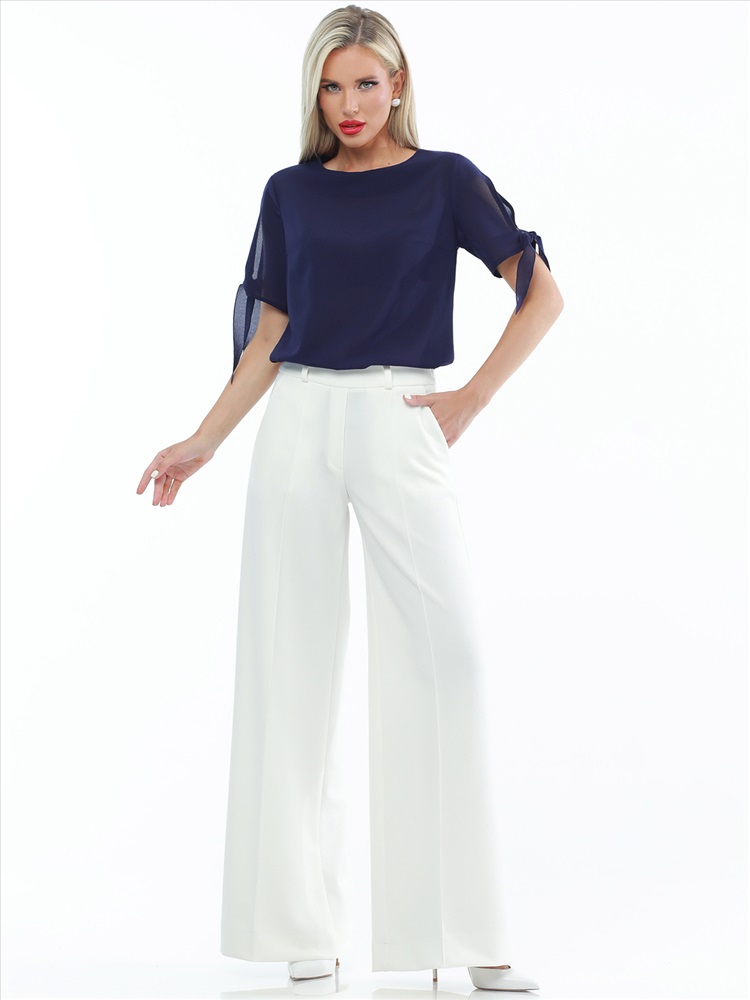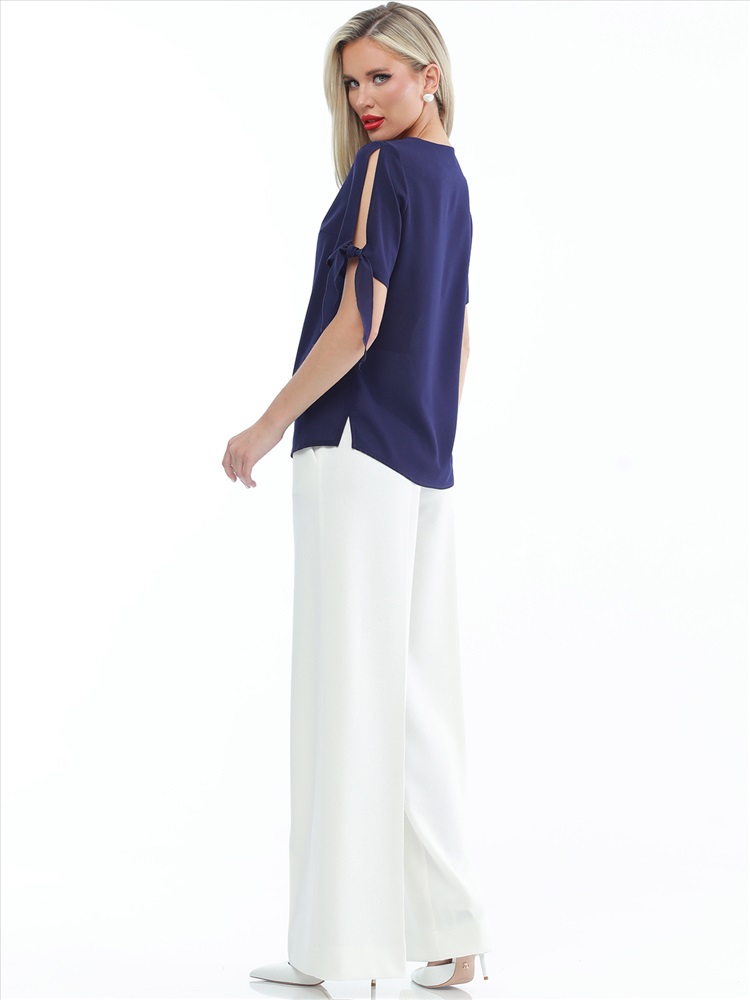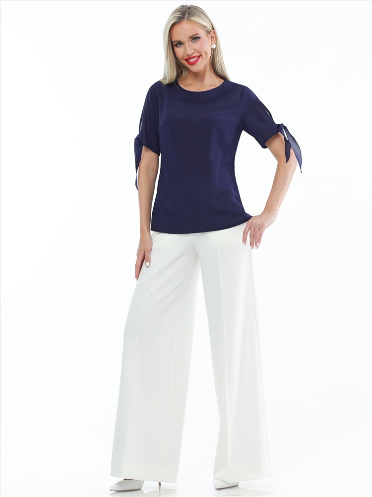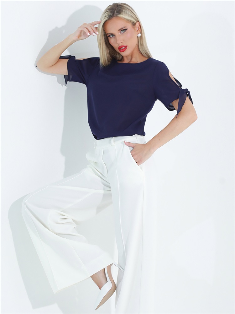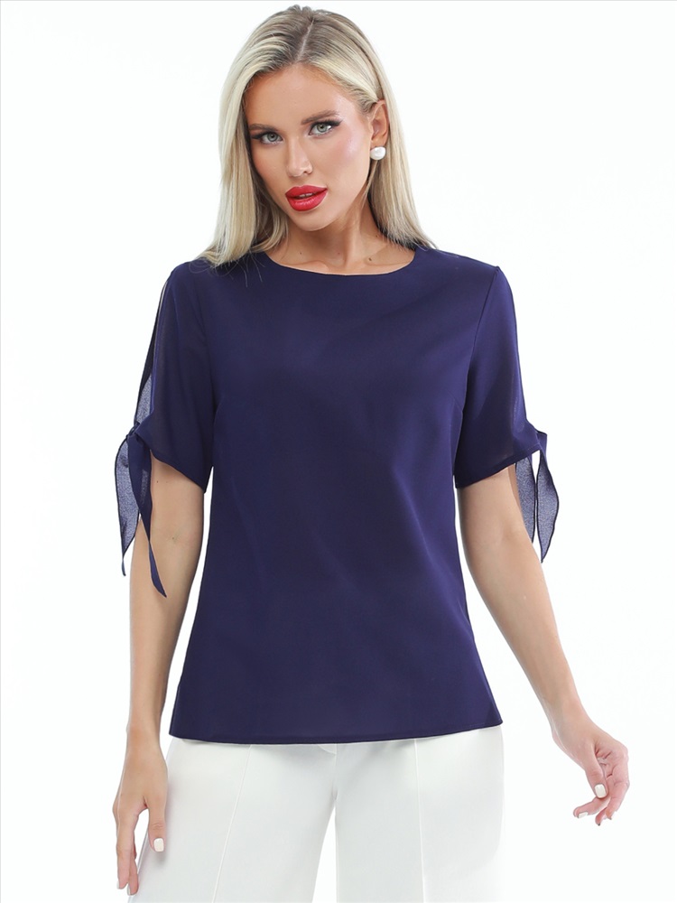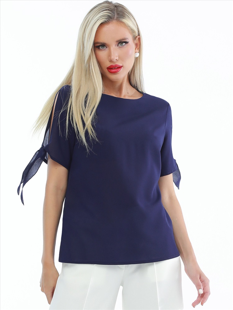 Легкая элегантная блузка из крепа для ваших летних образов. Свободный крой позволяет носить ее навыпуск и заправленной, сочетать с брюками и юбками. «Изюминка» блузки - короткий рукав с разрезом и завязками, которые не только позволят регулировать его ширину по вашей руке, но и сделают ваш повседневный образ более нарядным.