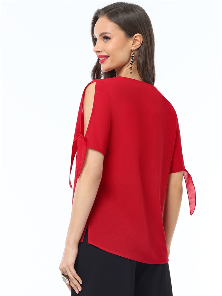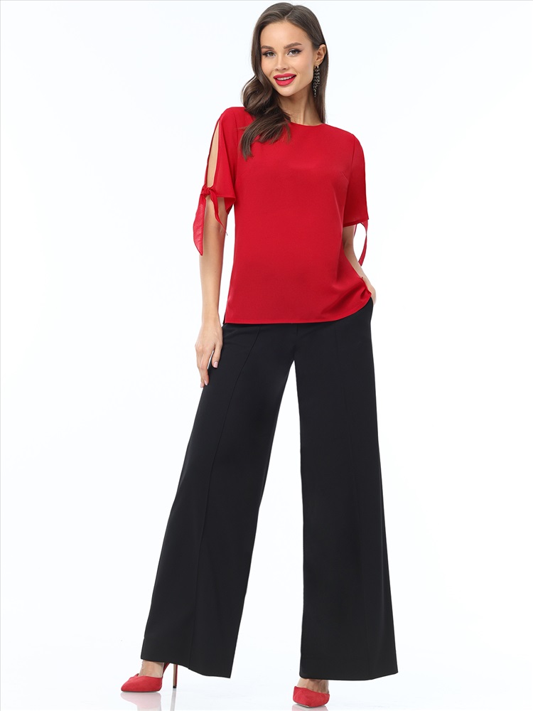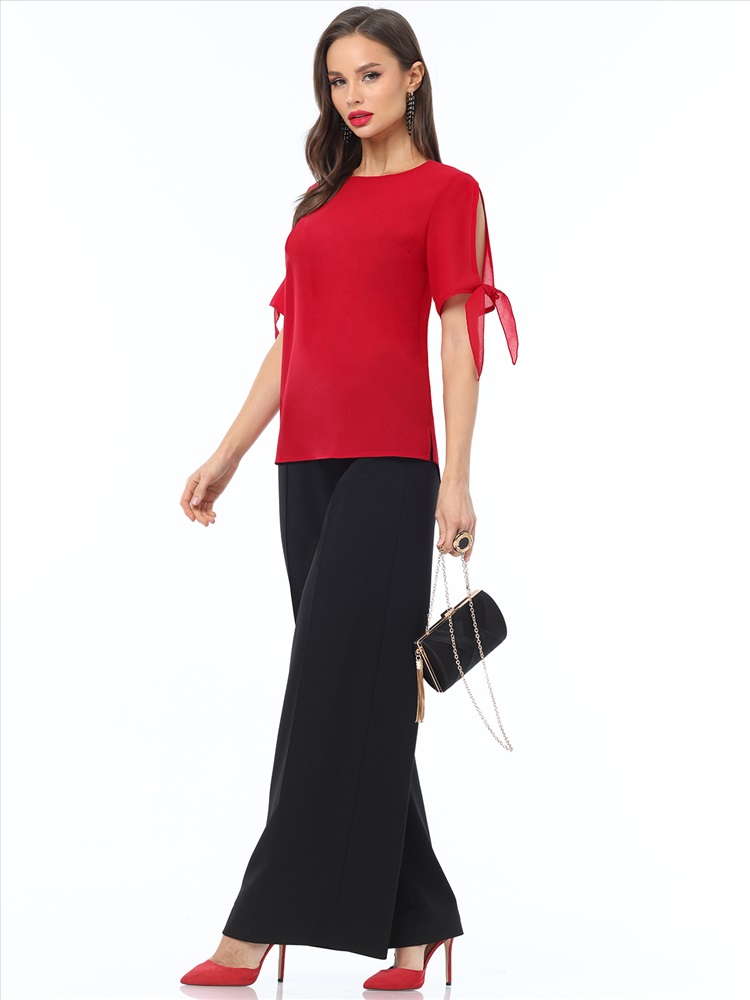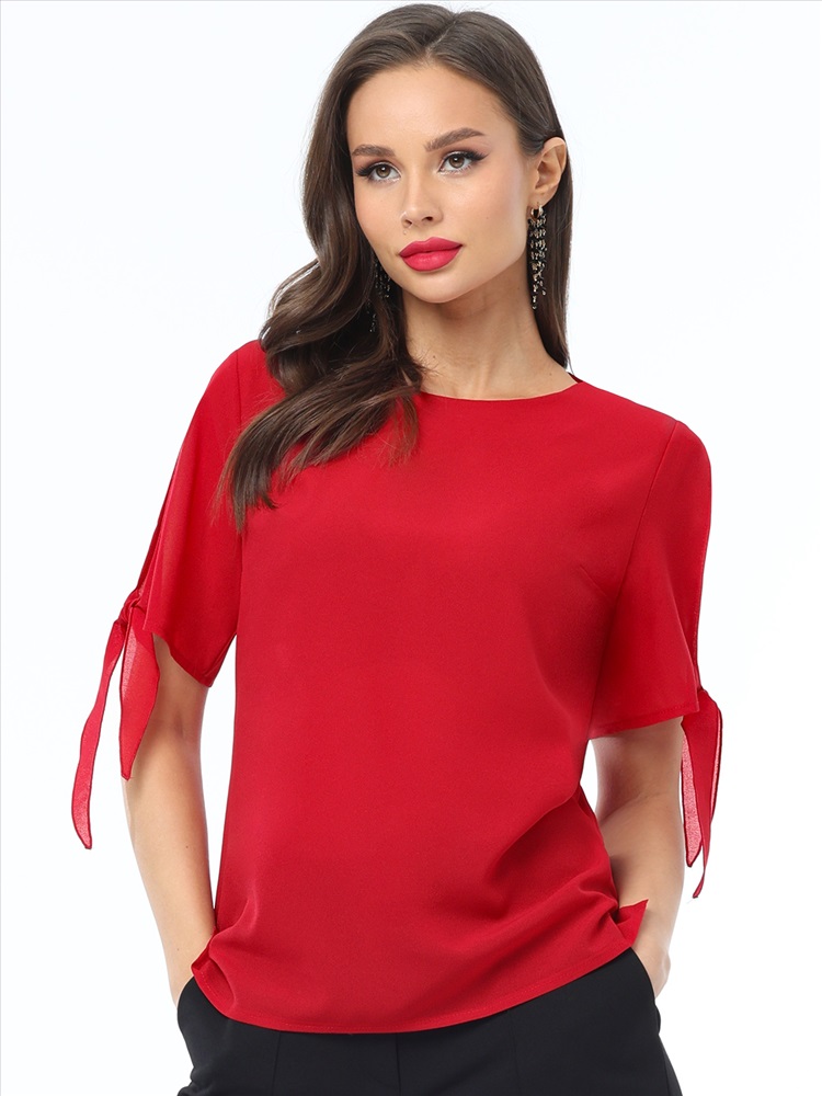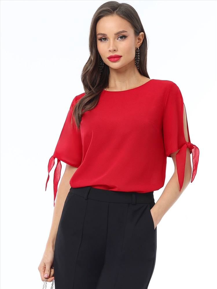 Легкая элегантная блузка из крепа для ваших летних образов. Свободный крой позволяет носить ее навыпуск и заправленной, сочетать с брюками и юбками. «Изюминка» блузки - короткий рукав с разрезом и завязками, которые не только позволят регулировать его ширину по вашей руке, но и сделают ваш повседневный образ более нарядным.