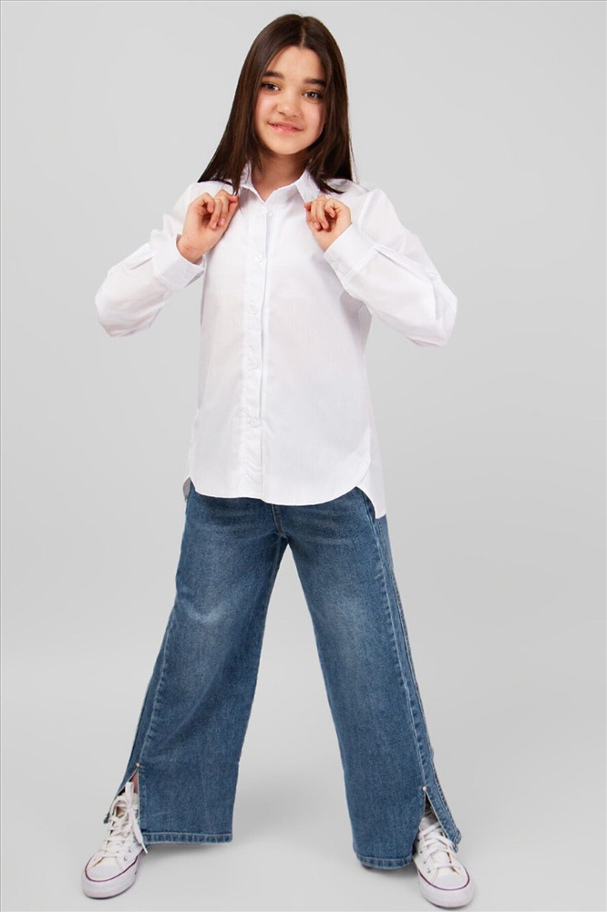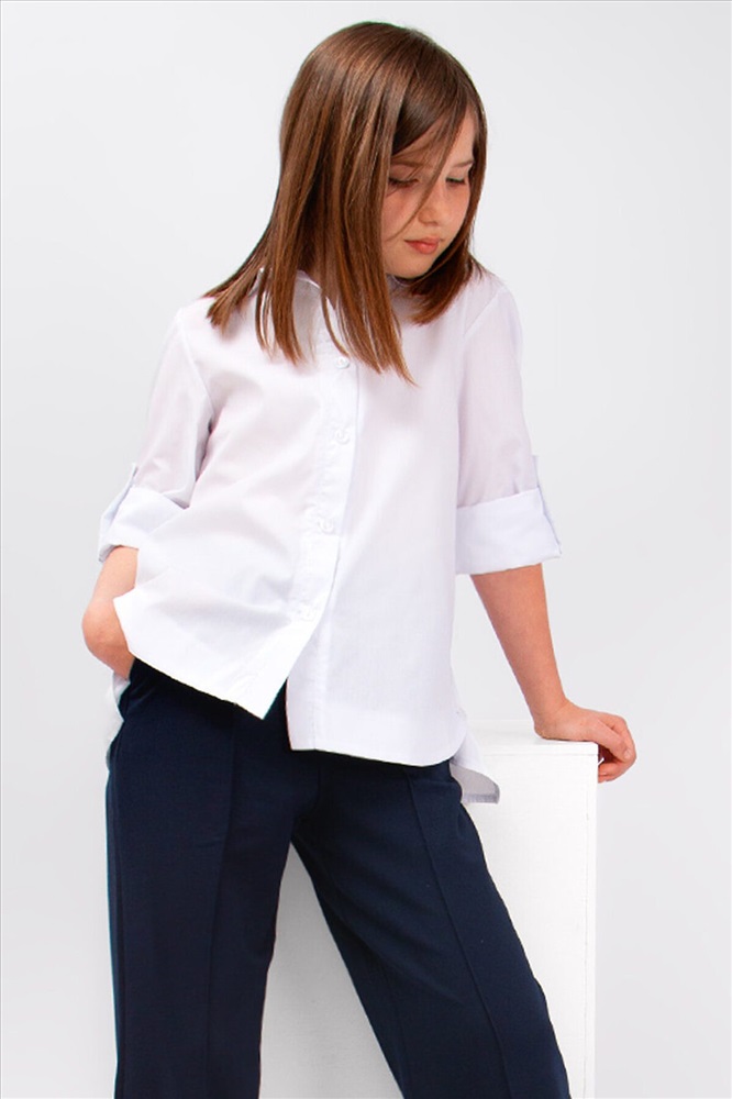 Блузка для девочки СольПерец на пуговицах. Асимметричная линия низа, рукава трансформируются в 3/4. Блузка прекрасно сочетается как с брюками, так и с юбкой, подчеркнет индивидуальный стиль девочки, и разнообразит ее повседневный школьный образ.