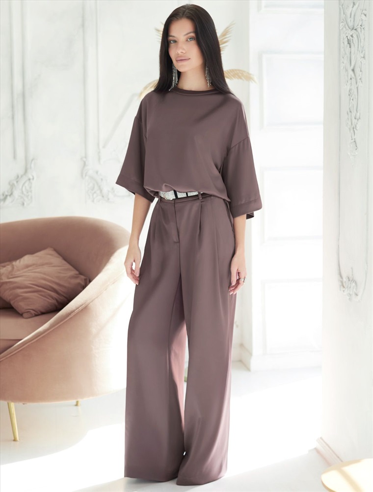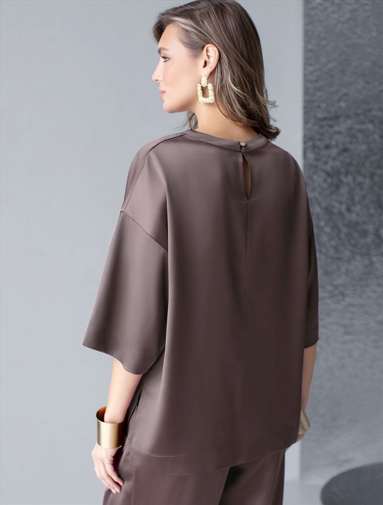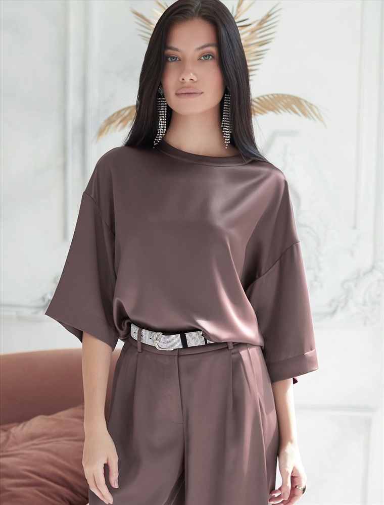 Плотность: 190 Г/м2 Блузка с короткими рукавами кофейного цвета из струящегося плотного сатина создана для ценительниц комфорта и элегантности. Материал отличается высокой плотностью, что делает блузку устойчивой к износу и сохраняет аккуратный внешний вид даже при длительном использовании. Струящаяся ткань элегантно ложится по фигуре, подчеркивая достоинства силуэта без лишней утяжеленности, в тоже время приятно ощущается на теле. Свободный крой блузки и спущенная линия плеча дарят ощущение легкости и непринужденности, делая образ одновременно женственным и современным. Широкие рукава средней длины гармонично дополняют образ и идеально подходят для полных рук, обеспечивая комфорт, свободу движений и уверенность. Аккуратная застежка на маленькую пуговицу добавляет утонченности, а круглый вырез красиво обрамляет шею, создавая аккуратную линию декольте. Блузка смотрится нарядно благодаря сочетанию мягкой текстуры сатина и его мягкого не вычурного блеска. Такая повседневная блузка легко впишется в деловой гардероб или станет отличным выбором для вечерней встречи с друзьями. Она гармонично сочетается с юбками, брюками или джинсами — вы сможете создать множество вариантов нарядов на каждый день или подобрать подходящий лук для особого случая, праздника или Нового года. Комментарии к товару